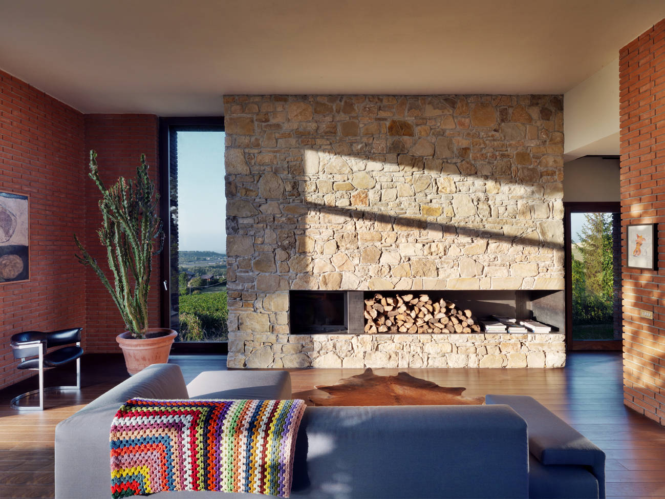 L’effetto muro a secco a tutta altezza porta un tocco di stile rustico, abbinato a forme squadrate ed essenziali tipicamente contemporanee.