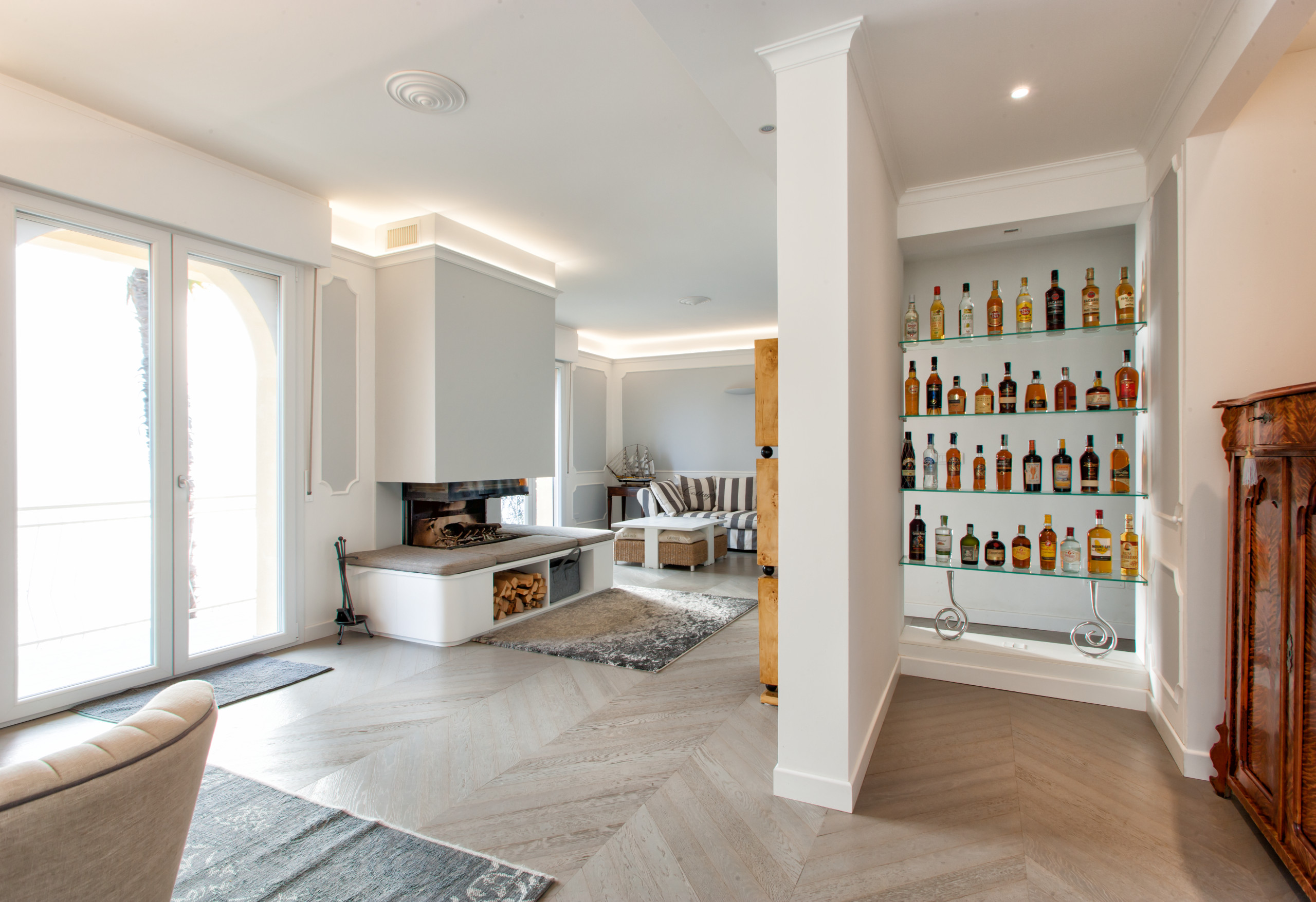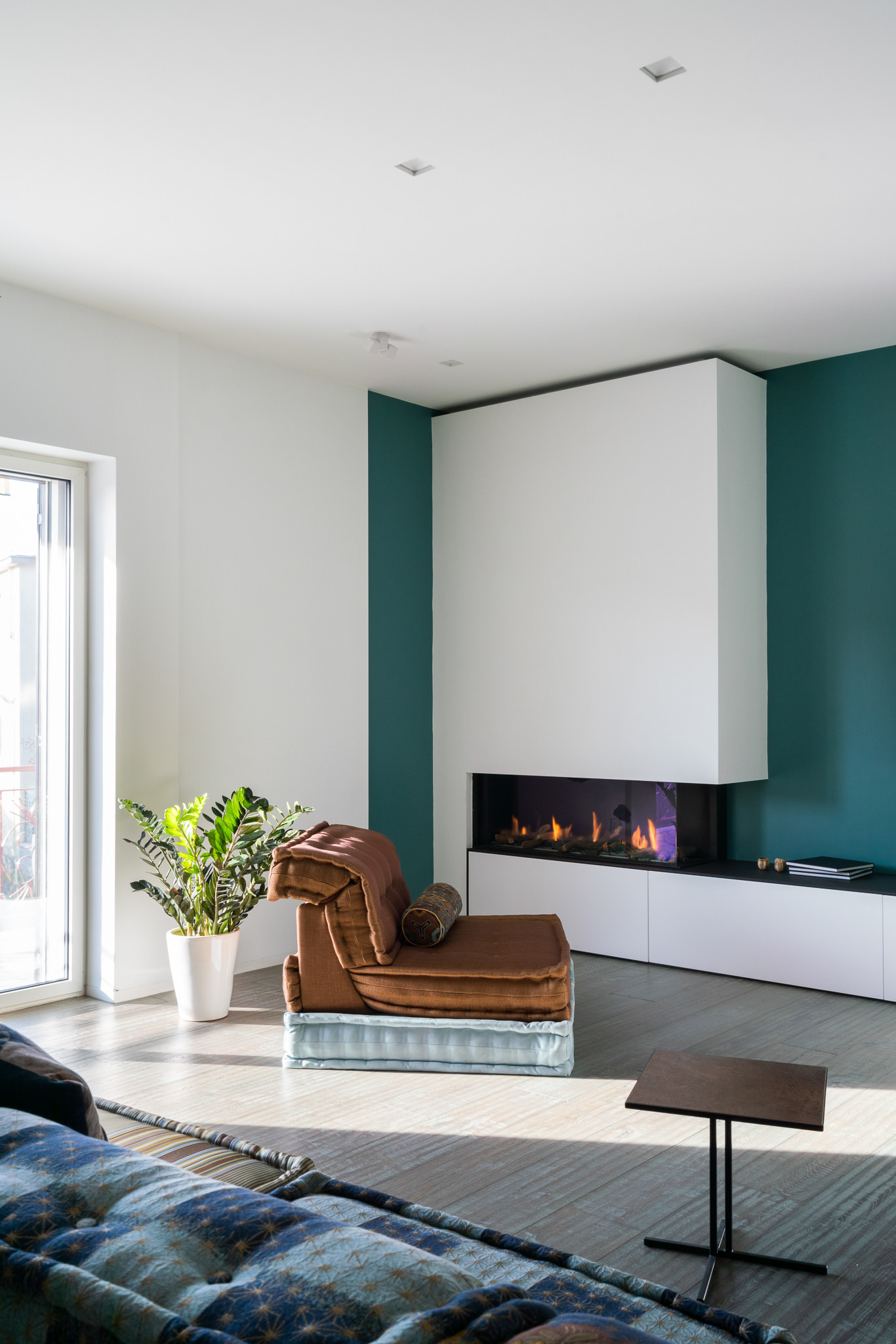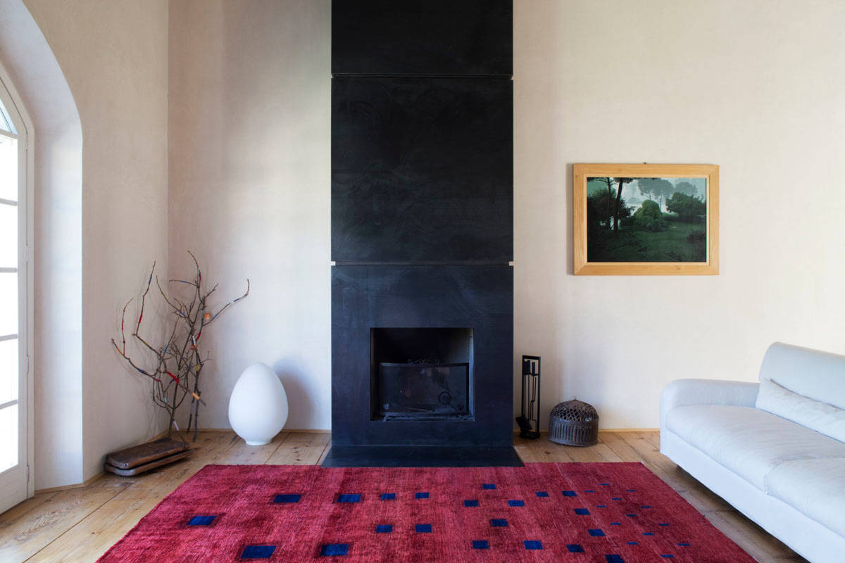 In questo progetto, il design del camino è contemporaneo, così come è innovativa la scelta di collocarlo su un lato, e non al centro, della parete.