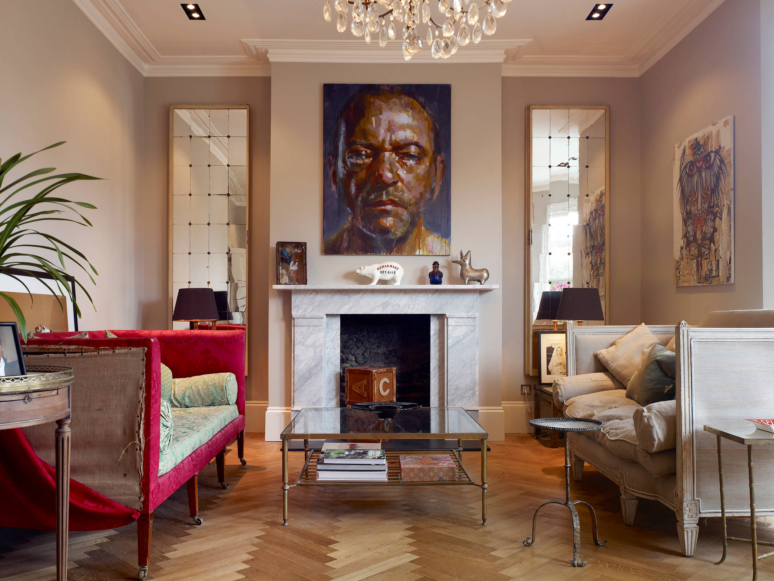 Il design classico di questo camino è reso contemporaneo e sorprendente dall’ìntervento con la pittura grigia sullo sfondo verde petrolio della parete.