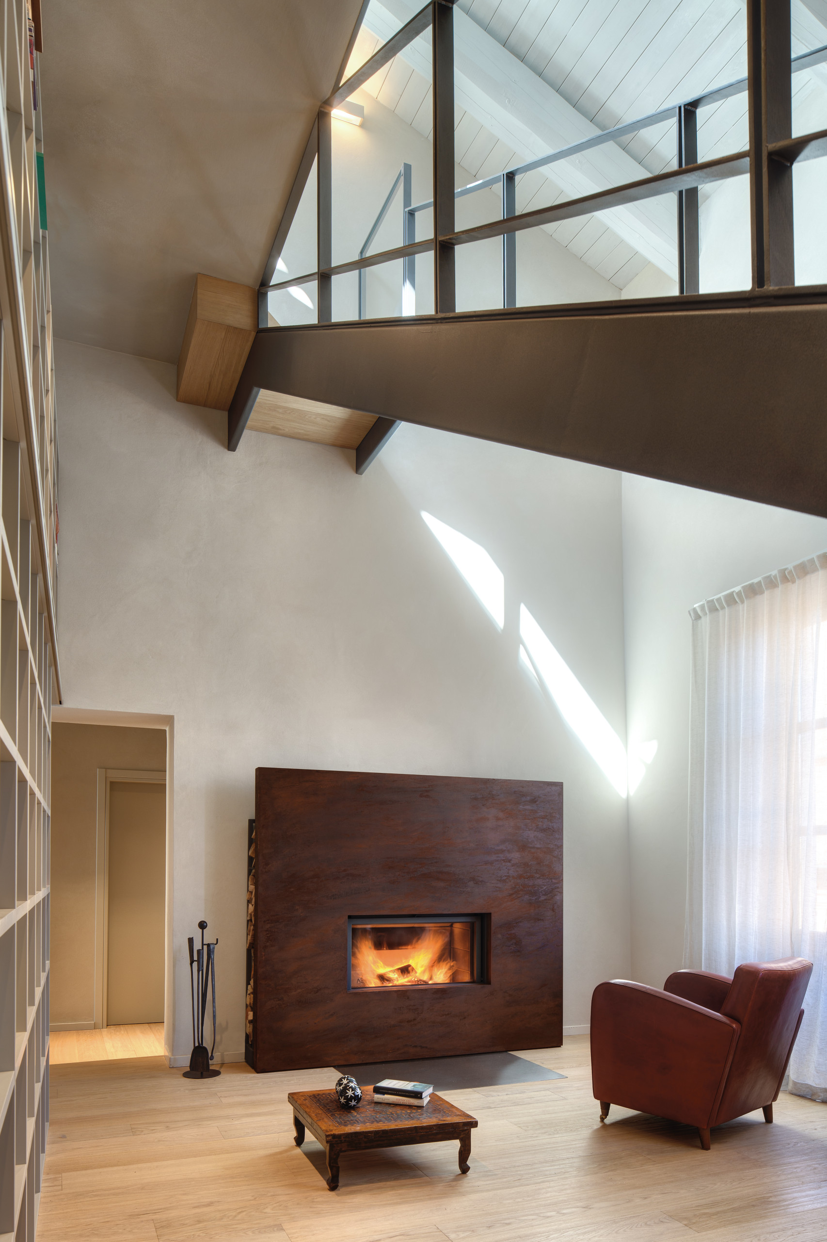 Altrettanto elegante, ma in modo del tutto diverso è la cornice di questo camino: una lastra di acciaio con apertura asimmetrica.
