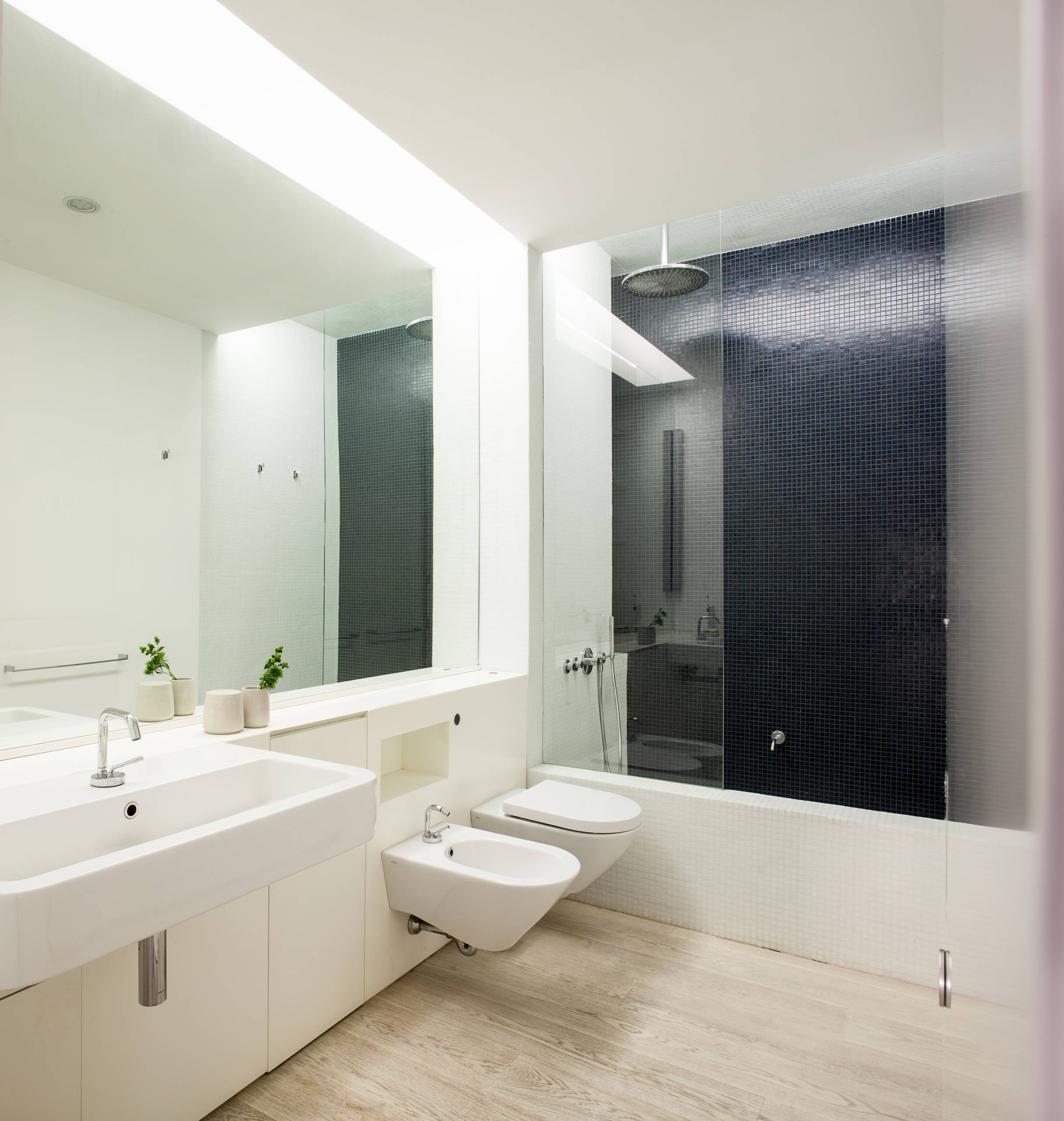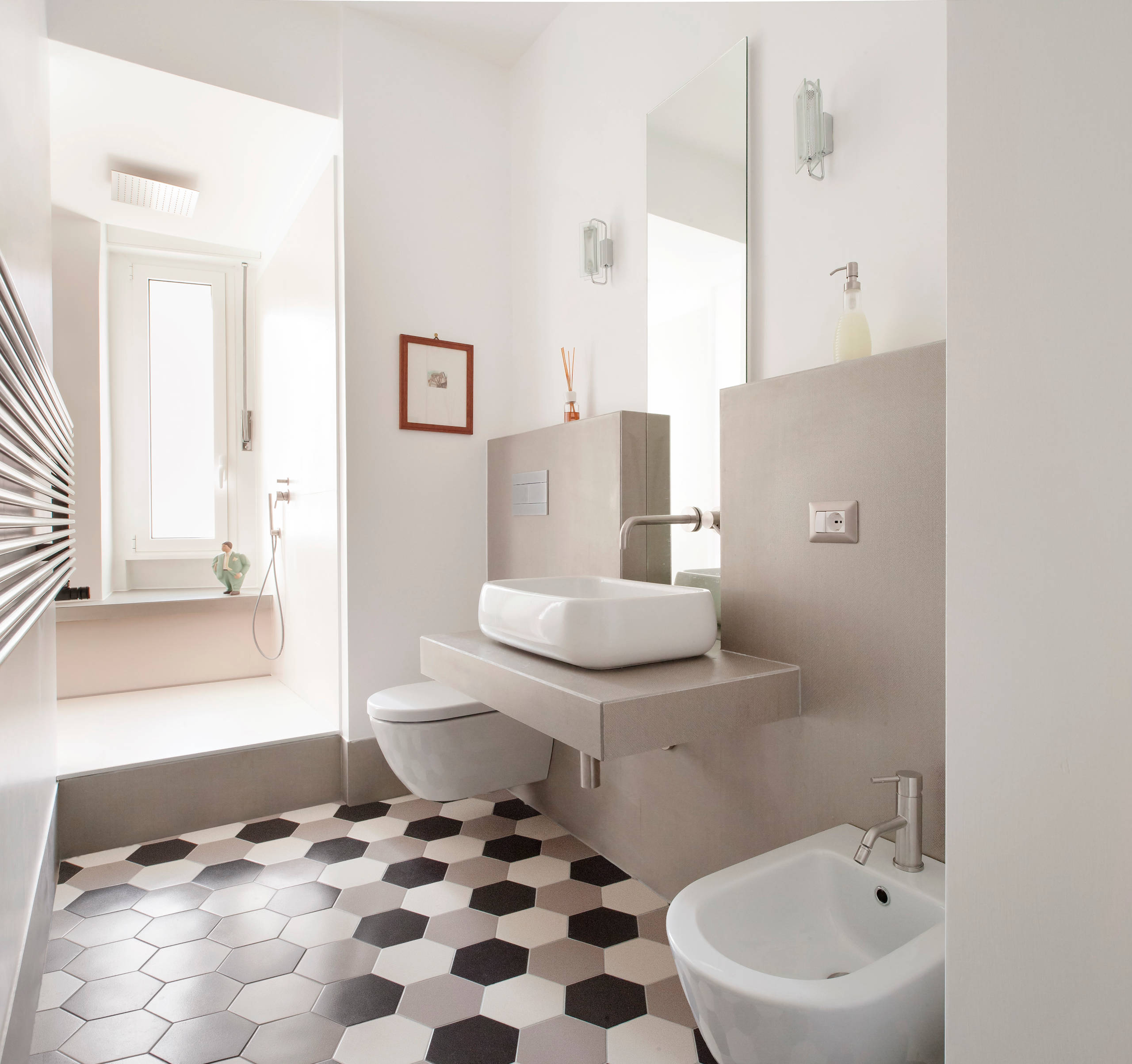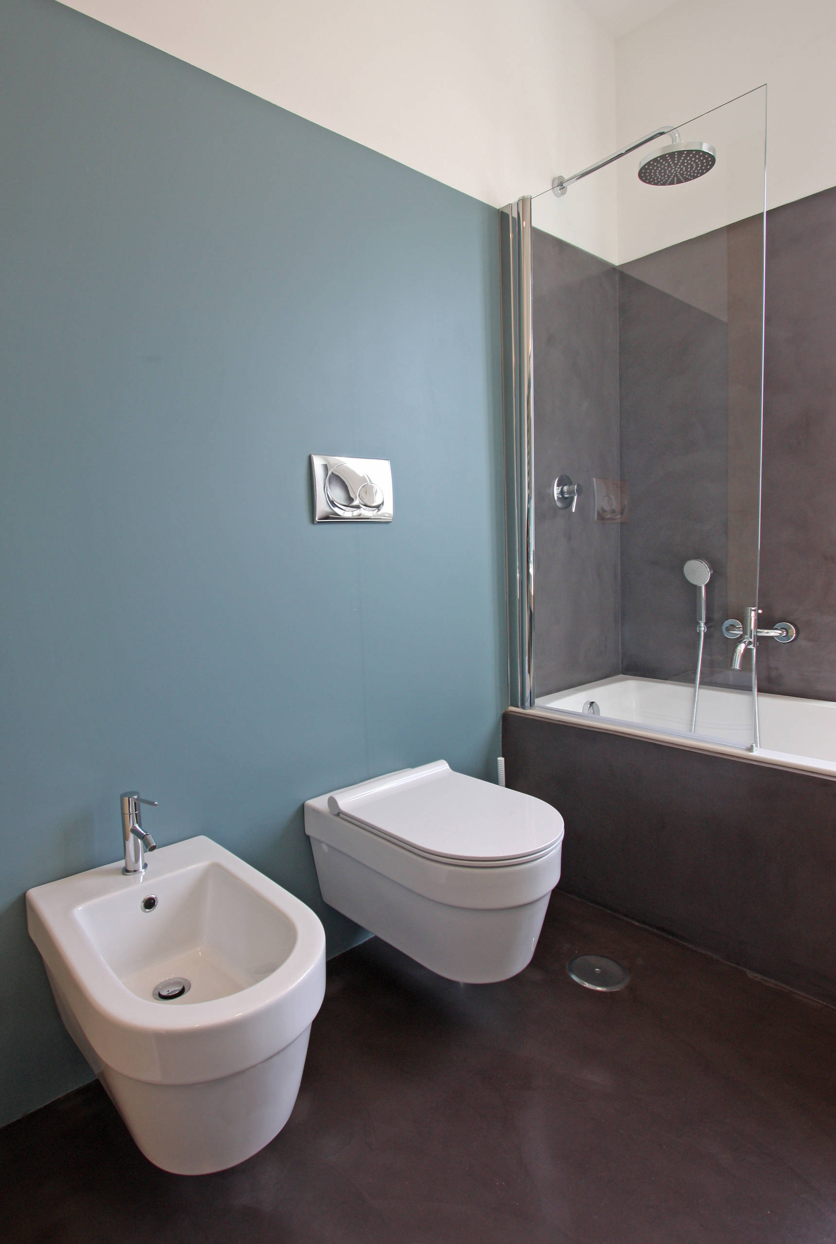 Per installare i sanitari sospesi è necessario disporre di una parete di almeno 10 cm di spessore. Niente paura se c’è il classico tramezzo da 8 cm (insufficiente): esistono soluzioni con cassetta integrata. In questo caso il muro aumenterà di spessore e potrà essere valorizzato, anche cromaticamente, come piano d’appoggio.