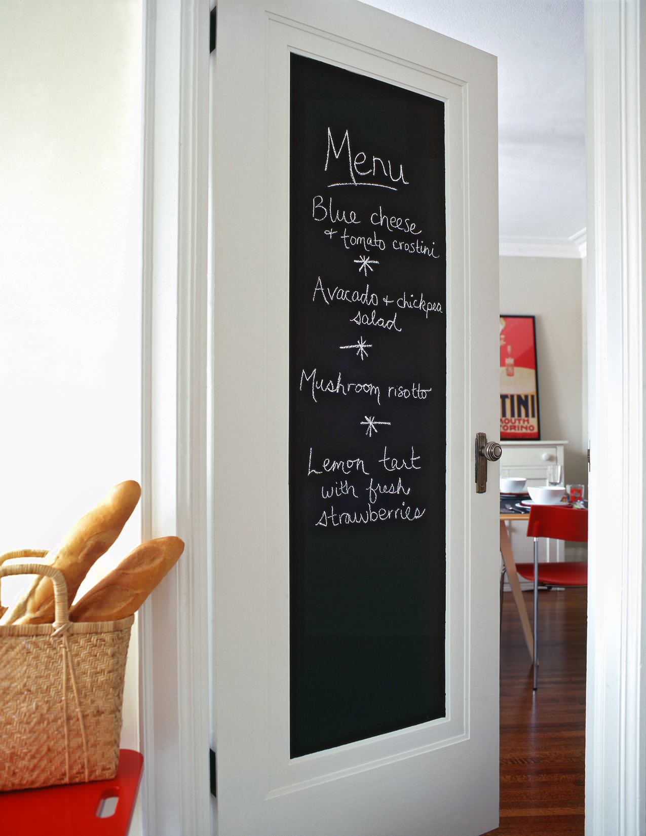 Più che una soluzione la risposta a un problema: sì, perché la vernice lavagna ha un alto potere coprente e se si vuole oscurare una porta, può essere la risposta meno costosa e più indicata. Basterà colorare un pannello di compensato o di multistrato della larghezza del vetro, applicarlo sulla porta, ed ecco trovata la risposta “tutta da scrivere” alla troppa luce.