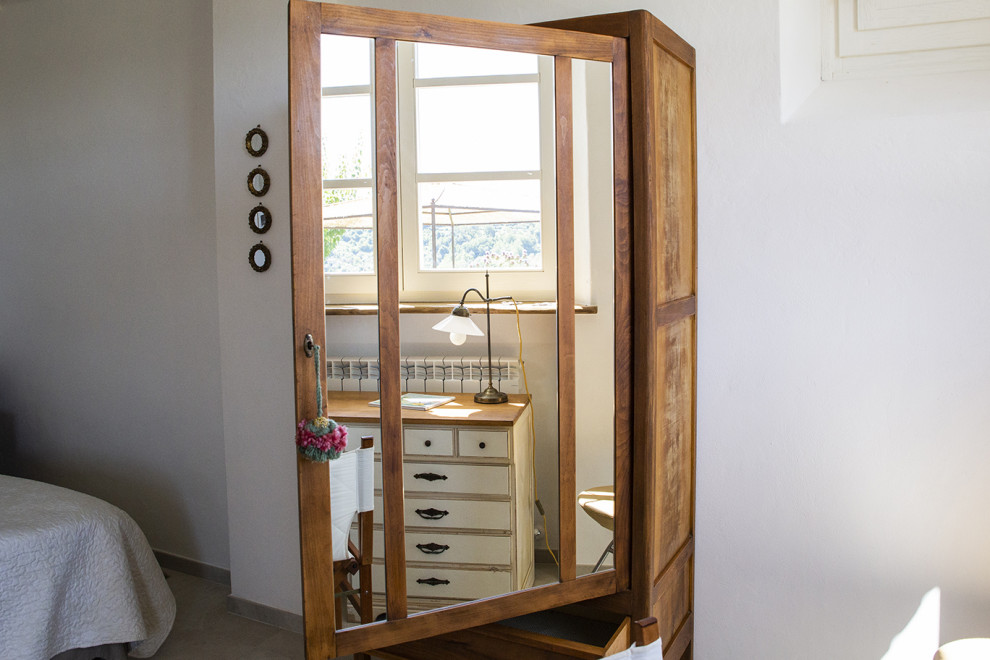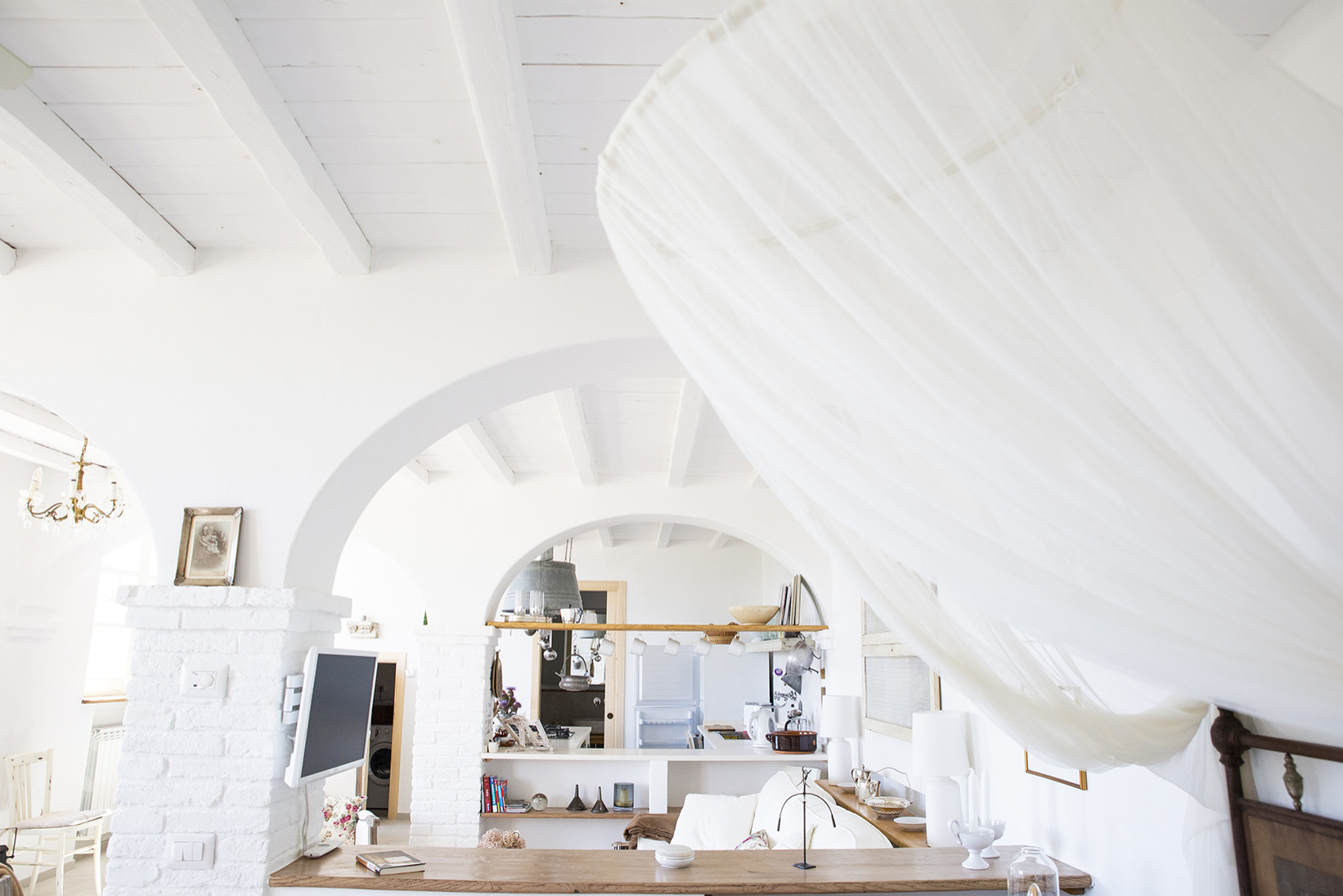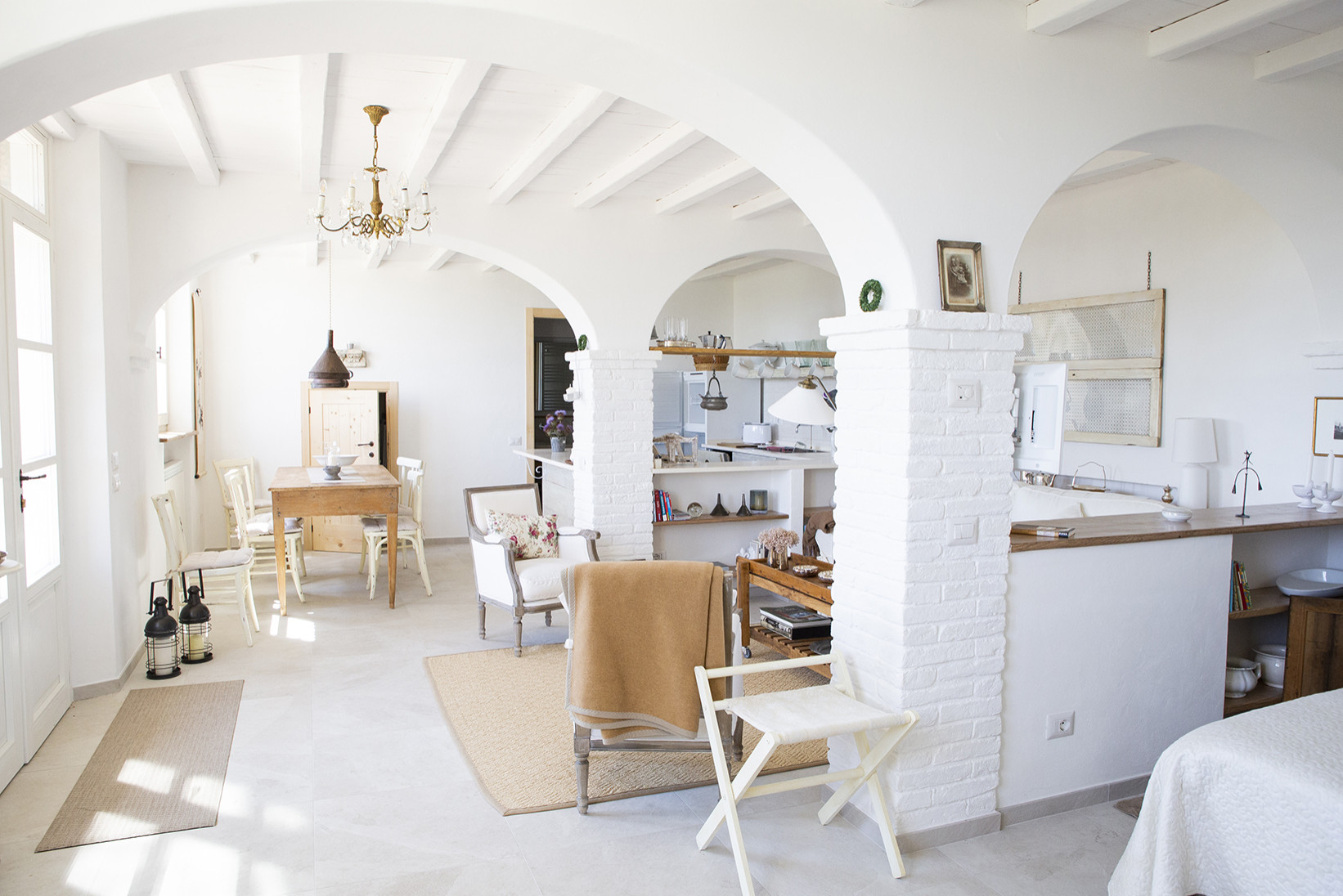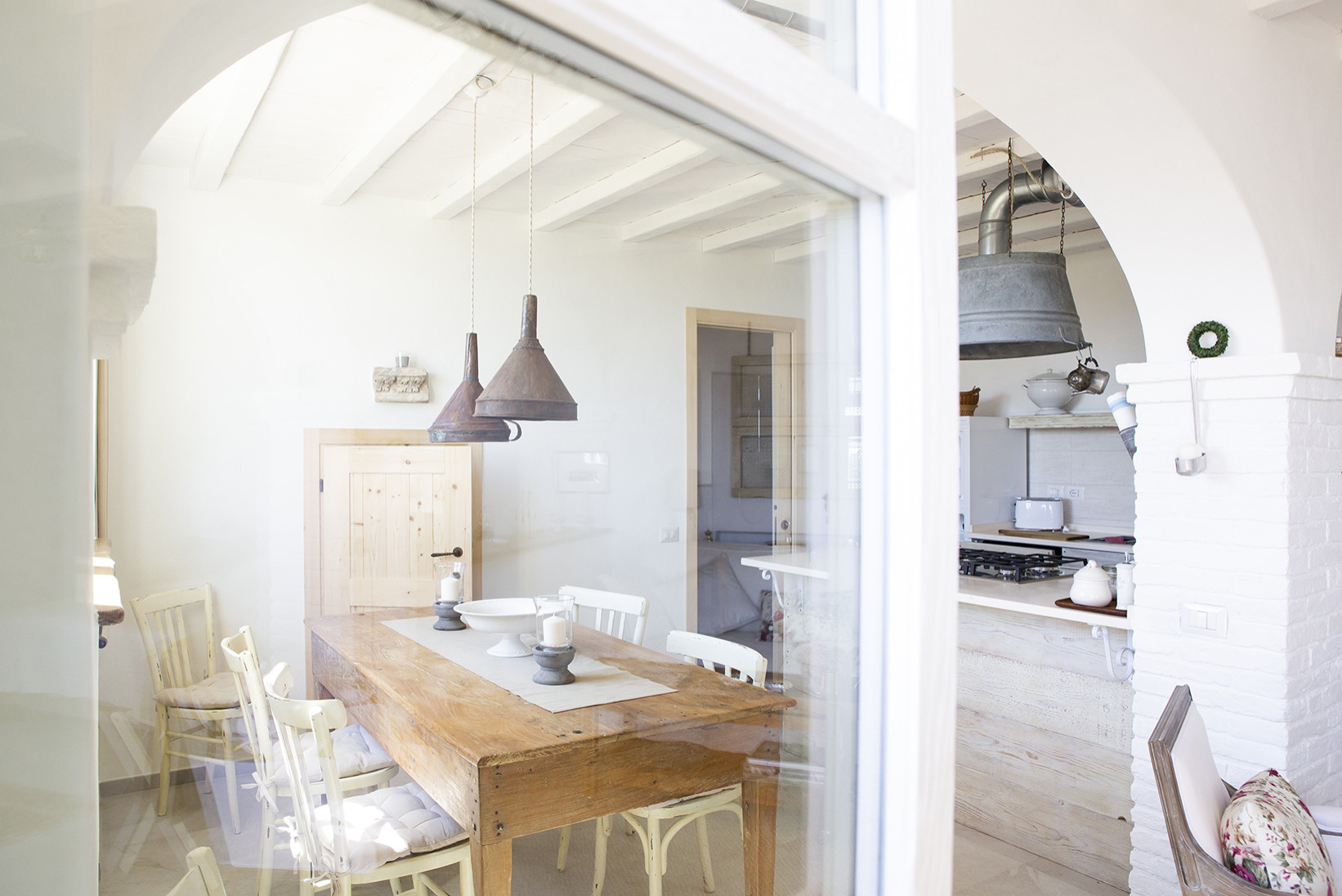 Il percorso architettonico ha previsto la ristrutturazione di questo spazio interrato e la trasformazione in una dépendance moderna che, nella sua semplicità e funzionalità, potesse ospitare amici della proprietà. «Abbiamo scelto di realizzarla con pilastri in mattoni e archi a due centri, soffitto in tavole di legno poste su travi, abbiamo verniciato tutto di bianco, come accade spesso per semplicità di intervento su vecchie strutture. Il pavimento è in gres porcellanato bianco simil pietra; gli infissi, performanti, sono in rovere spazzolato, realizzati artigianalmente e verniciati sempre bianchi. Gli archi, realizzati in cartongesso, sono stati intonacati, mentre i pilastri in cemento armato sono stati rivestiti con vecchi mattoni; le contro-soglie delle finestre sono state realizzate con tavole in legno di castagno“invecchiato”. La maggior parte dei mobili, e così i dettagli d’arredo, sono stati recuperati o costruiti artigianalmente per restare fedeli allo spirito del luogo».