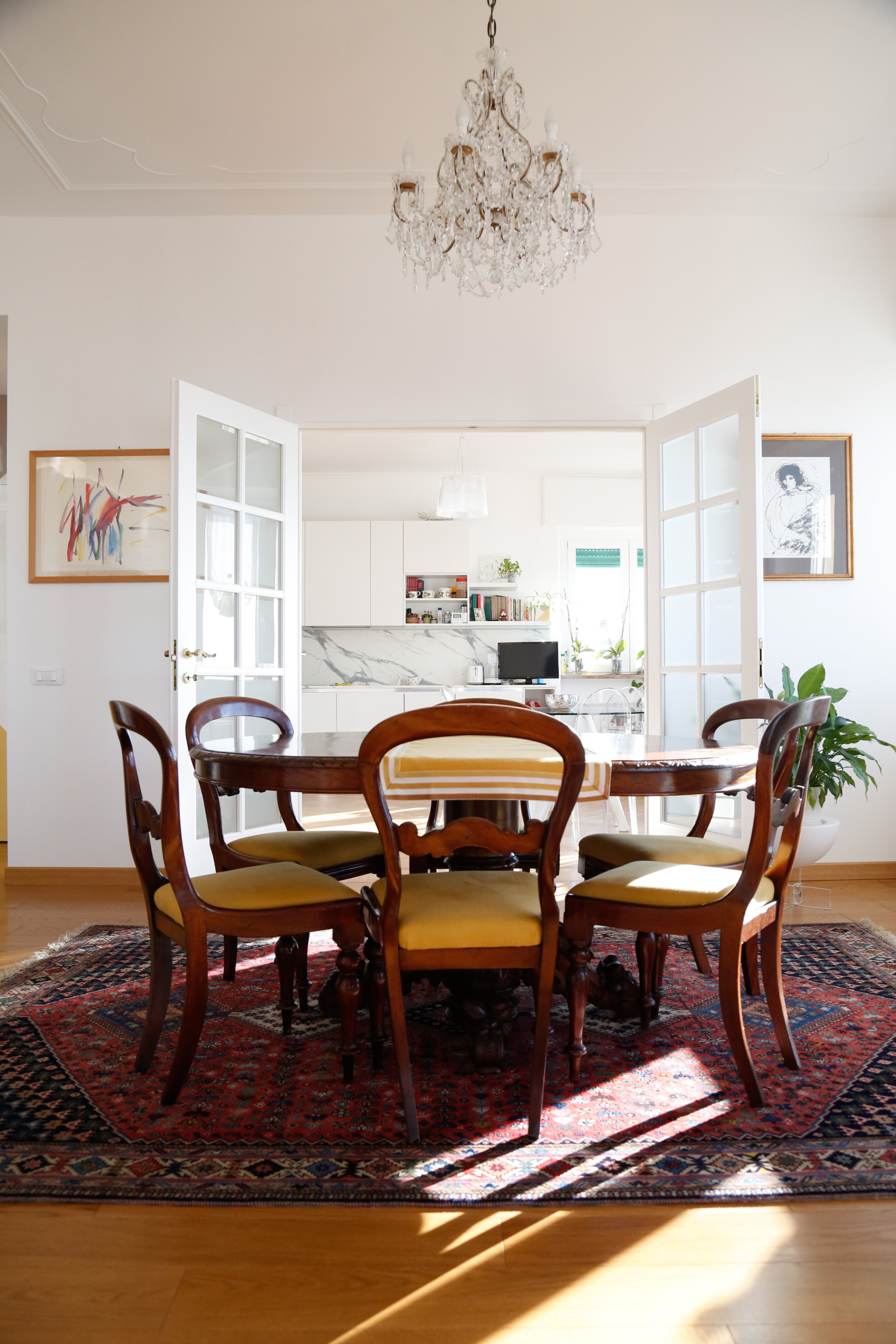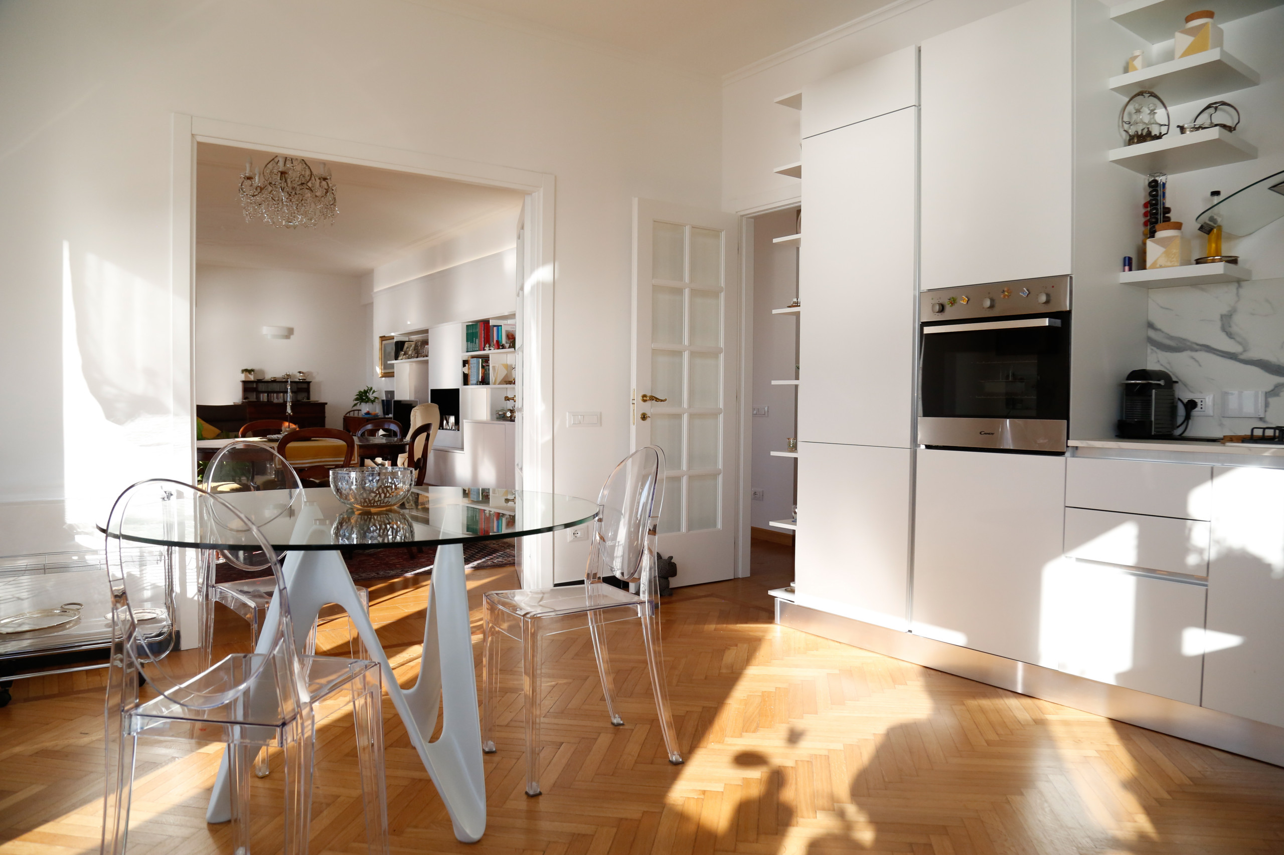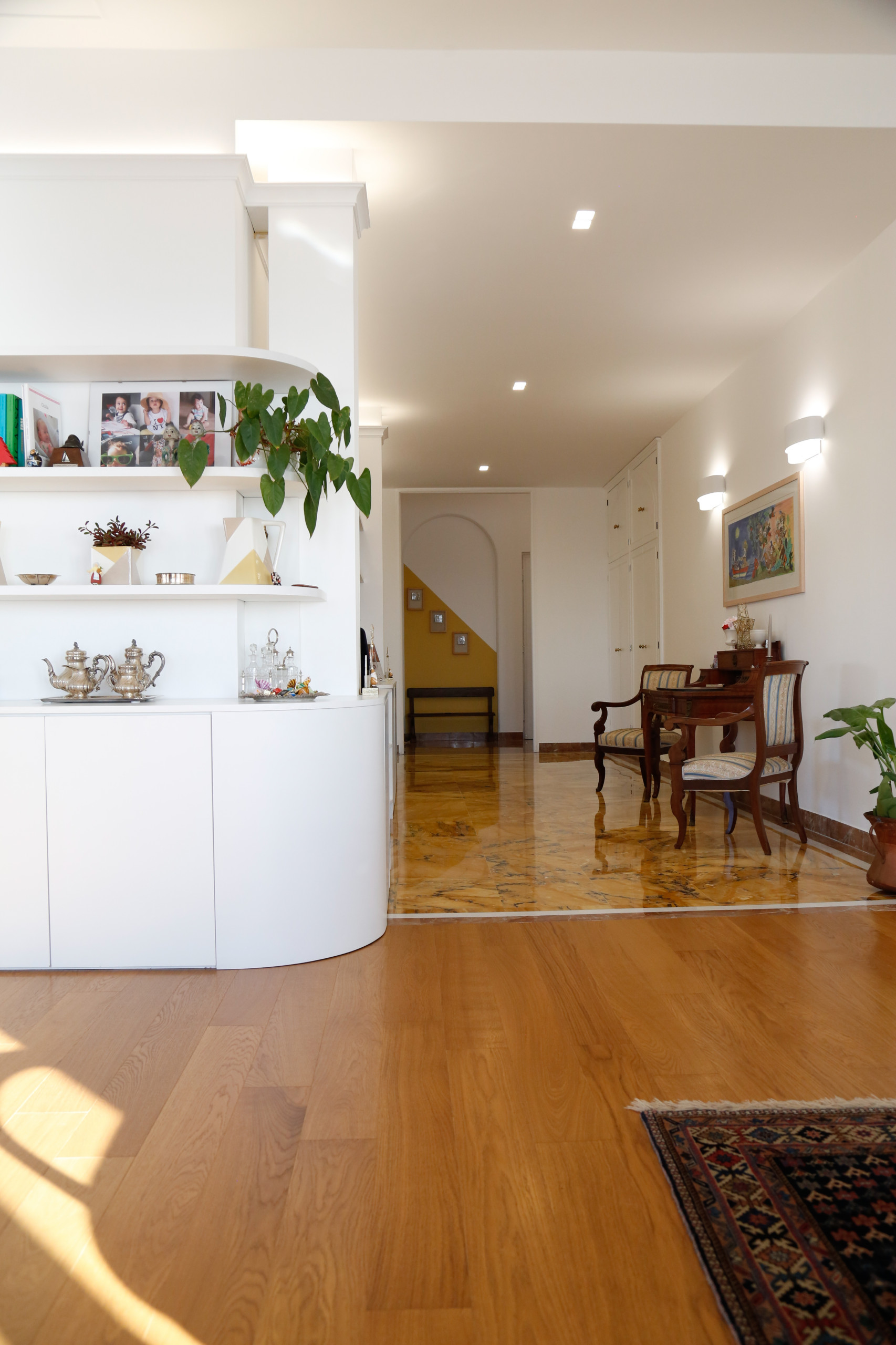 In questo ambiente il pavimento è stato sostituito con un parquet color miele che funge da giuntura tra il marmo del corridoio e il parquet in rovere originario che troveremo in cucina.