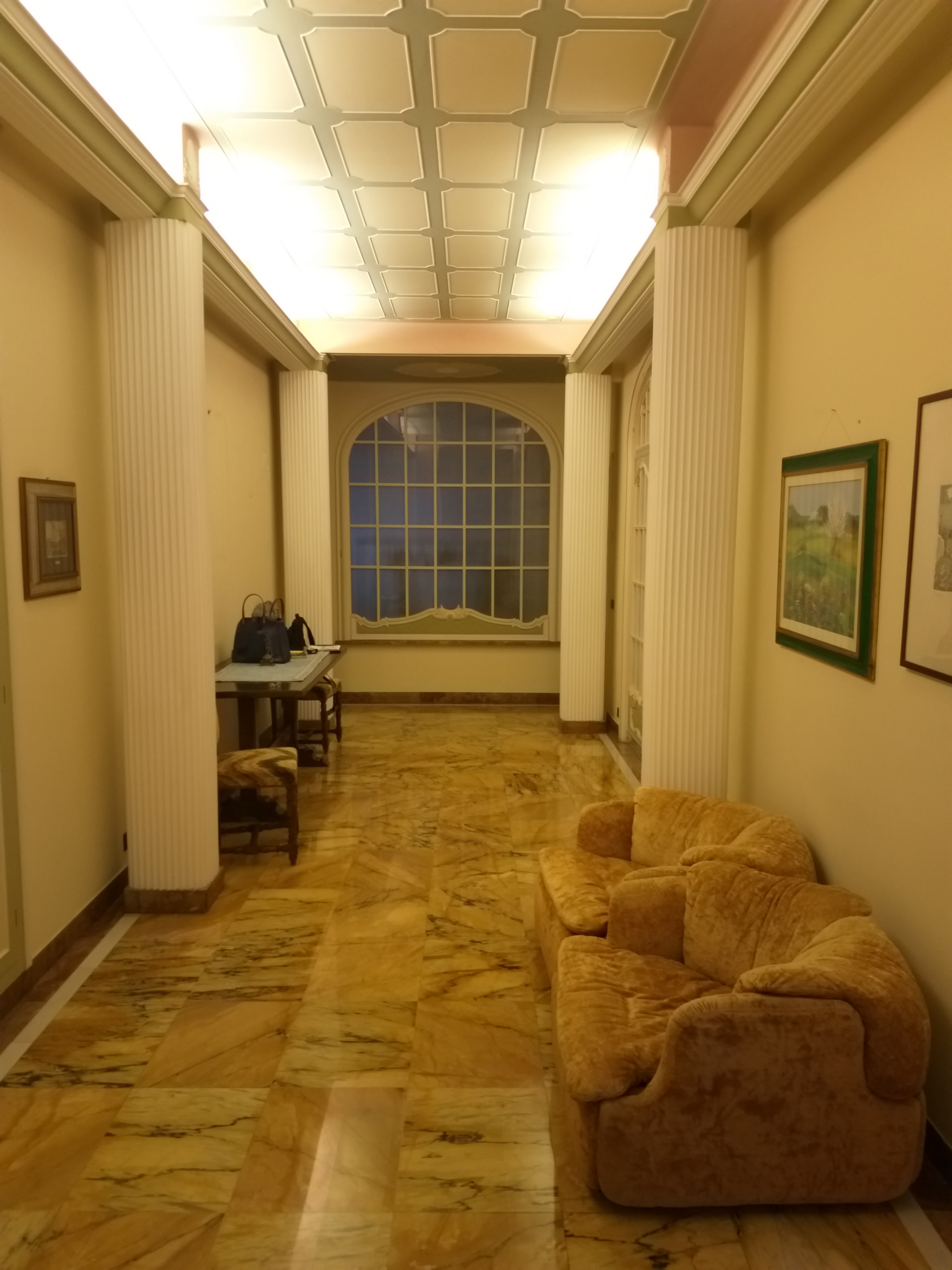 Questo è lo stesso corridoio visto dall’altro lato. Il pavimento è stato conservato «il marmo ocra è di grande pregio ed è stato restaurato e lucidato a specchio» spiega l’architetta Solera.