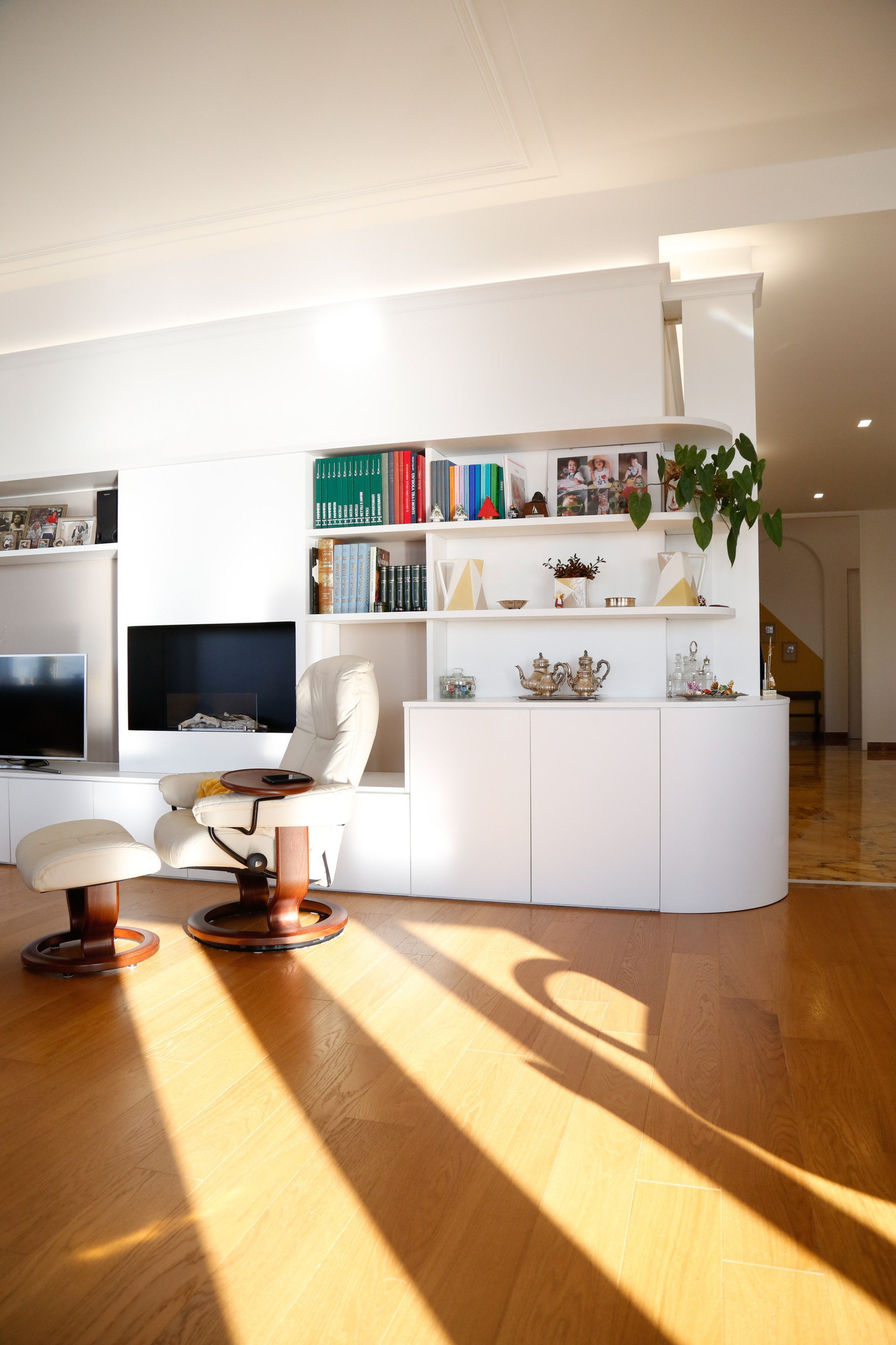 Anche qui domina il bianco e l’arredo è essenziale e contemporaneo. Qui era presente un parquet in rovere massello che è stato sverniciato per riportarlo al colore originale e riverniciato rispettando la colorazione naturale.