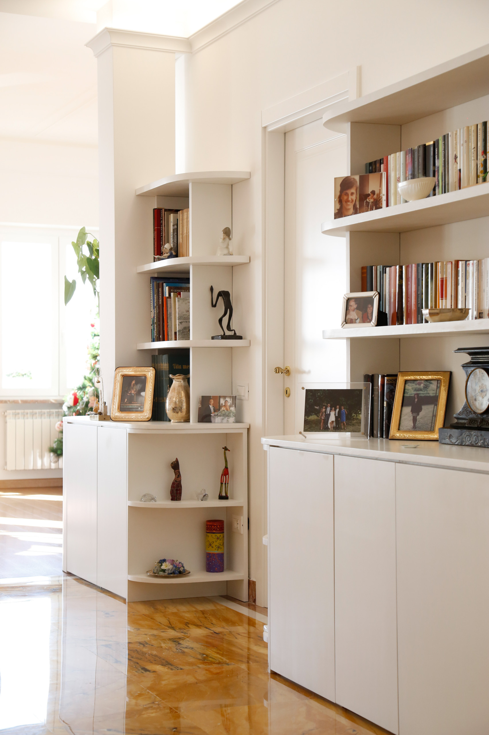 Proseguendo si accede allo spazio che ospita salotto e zona pranzo. La libreria contenitore su misura si sviluppa su 9,8 metri nascendo in salotto e seguendo la curva del corridoio.