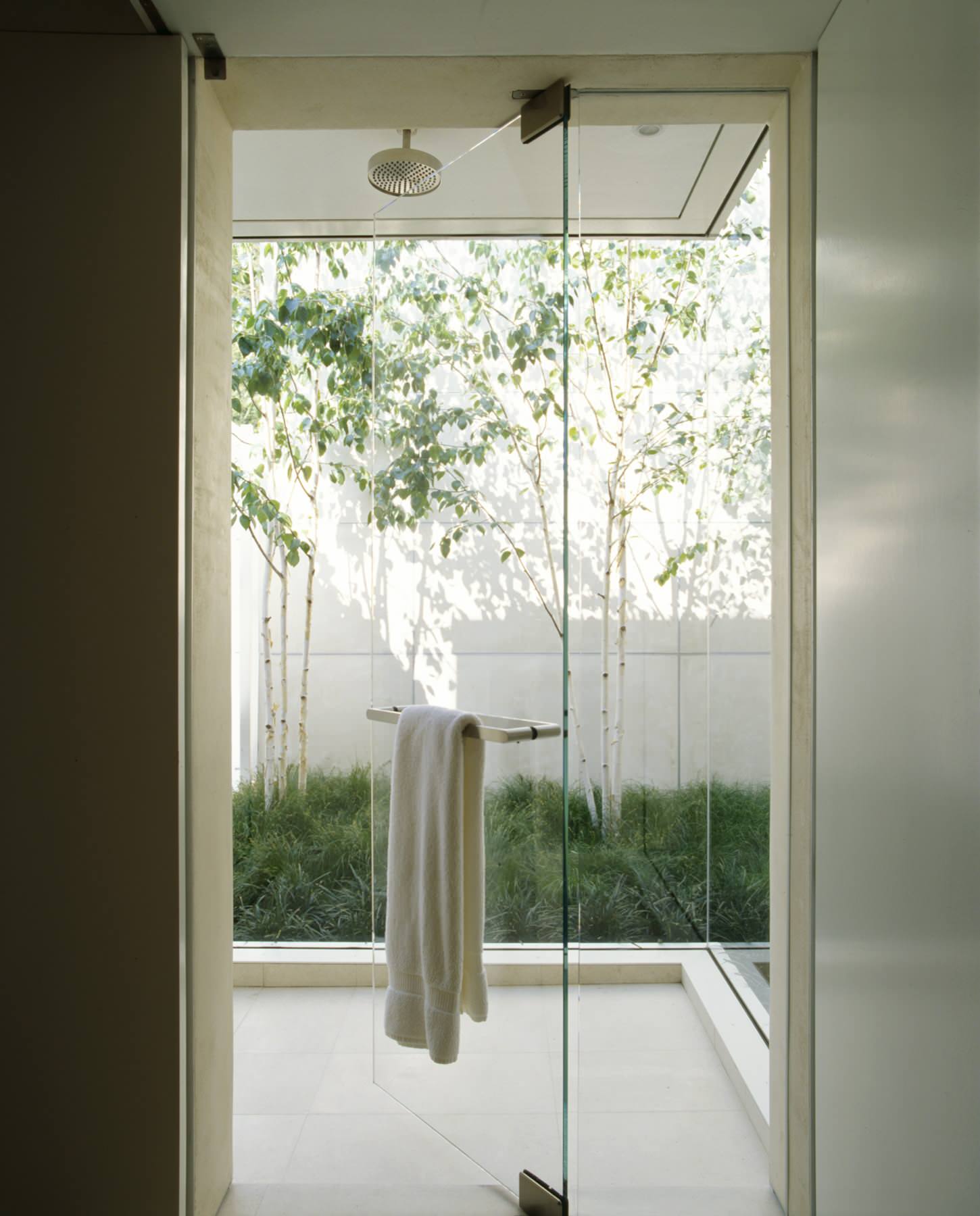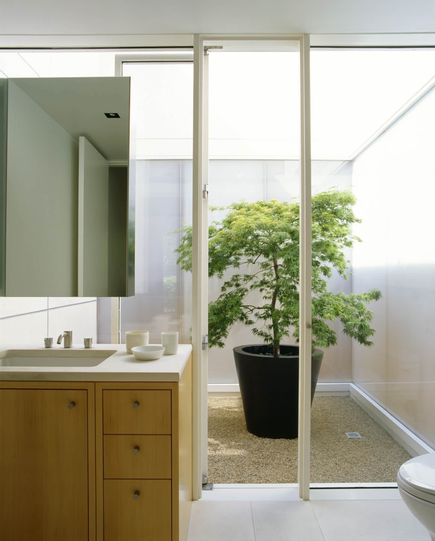 Se non potete portare il bagno al di là delle pareti, la soluzione che più vi si avvicina è rappresentata da… pareti trasparenti. In questa casa di Marin County, vicino a San Francisco, l’architetto Dirk Denison ha creato un passaggio continuo tra interni ed esterni con un uso sapiente di pareti di vetro e corti. La superficie di ogni stanza si estende fino a comprendere il piccolo giardino su cui si affaccia: spesso, laddove ti aspetteresti di trovare una parete, c’è del vetro. Grazie al serramento a tutta altezza, questo bagno prospetta su un cortile interno, e lo specchio si libra leggero, come sospeso per aria.