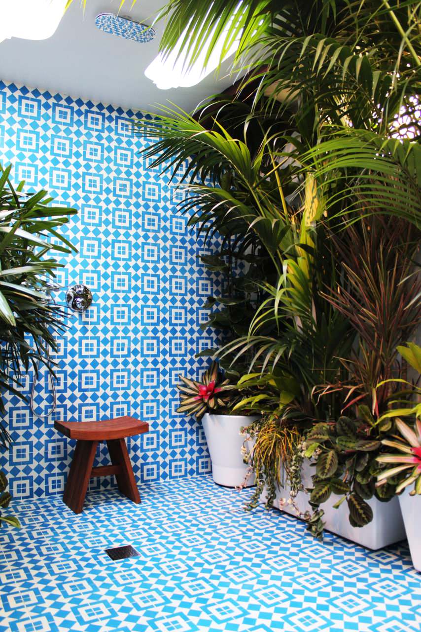 Si può anche osare di più: questa spettacolare collezione di palme, piante grasse e tropicali ha dato vita a una zona doccia strepitosa. Qui il tutto, ovviamente, è arricchito da stupende piastrelle!