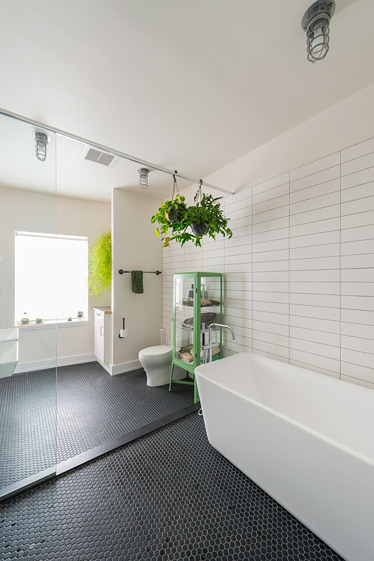 Per addolcire l’atmosfera di una stanza da bagno è sufficiente anche una minuscola macchia di verde. Lo stile industriale di questo bagno, per esempio, è stato decisamente ammorbidito con due semplici piantine appese.