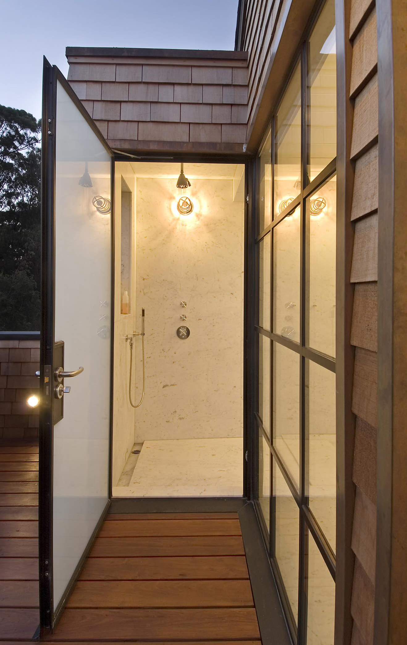 Un’altra idea per farsi una bella doccia godendosi la vista sull’esterno è aprire una porta proprio a fianco della cabina. In questa villetta a schiera, a San Francisco, l’architetto Malcolm Davis ha costruito una magnifica doccia con tanto di apertura sul terrazzo. Questa soluzione presenta un ulteriore vantaggio: grazie alla porta che permette di accedere direttamente alla doccia, i padroni di casa evitano di sporcare in giro quando rientrano dalla spiaggia o dal giardino.