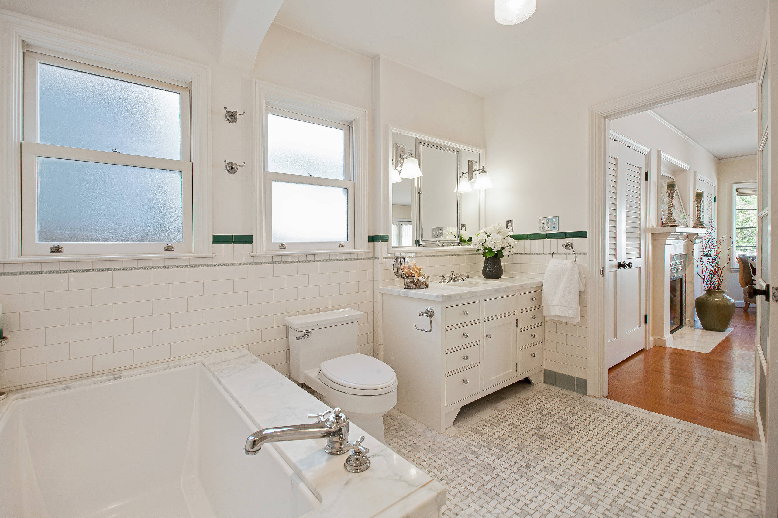 I rivestimenti a tutta parete, spesso con piastrelle decorate e di dimensioni piccole, sono un classico per i bagni di stile tradizionale, come quello in questa foto e nella successiva.