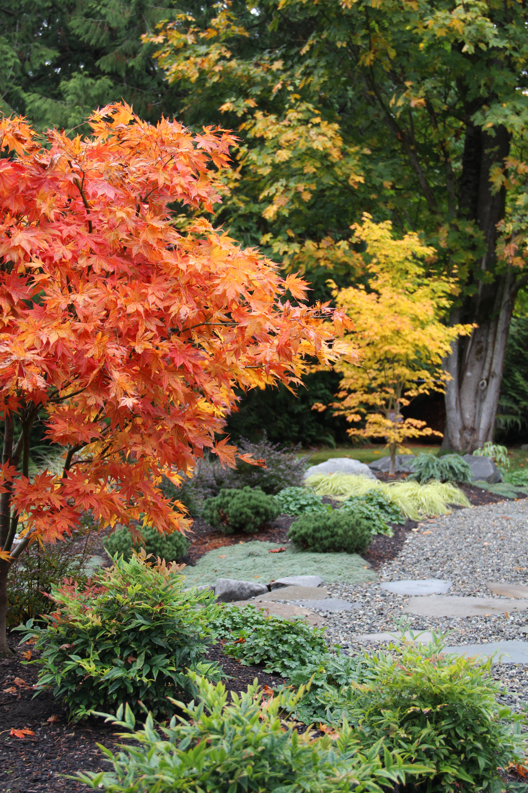 Sia che lo si scelga tra le varietà a foglia verde o dorata o tra quelle a foglia scarlatta, risulta particolarmente d’effetto l’abbinamento a conifere basse di colore grigio, come Picea pungens ‘Globosa Nana’; l’acero inoltre gradisce la leggera acidità ceduta al terreno dalle conifere.