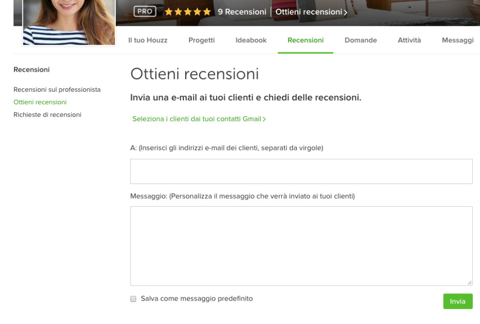 Per cominciare a ricevere recensioni, non devi fare altro che cliccare sul tab “Ottieni recensioni” presente nel tuo profilo Houzz e inserire gli indirizzi email dei tuoi clienti, precedenti o attuali*. Puoi inviare loro un messaggio personalizzato chiedendo loro di scriverti una recensione su Houzz in merito al tuo lavoro.