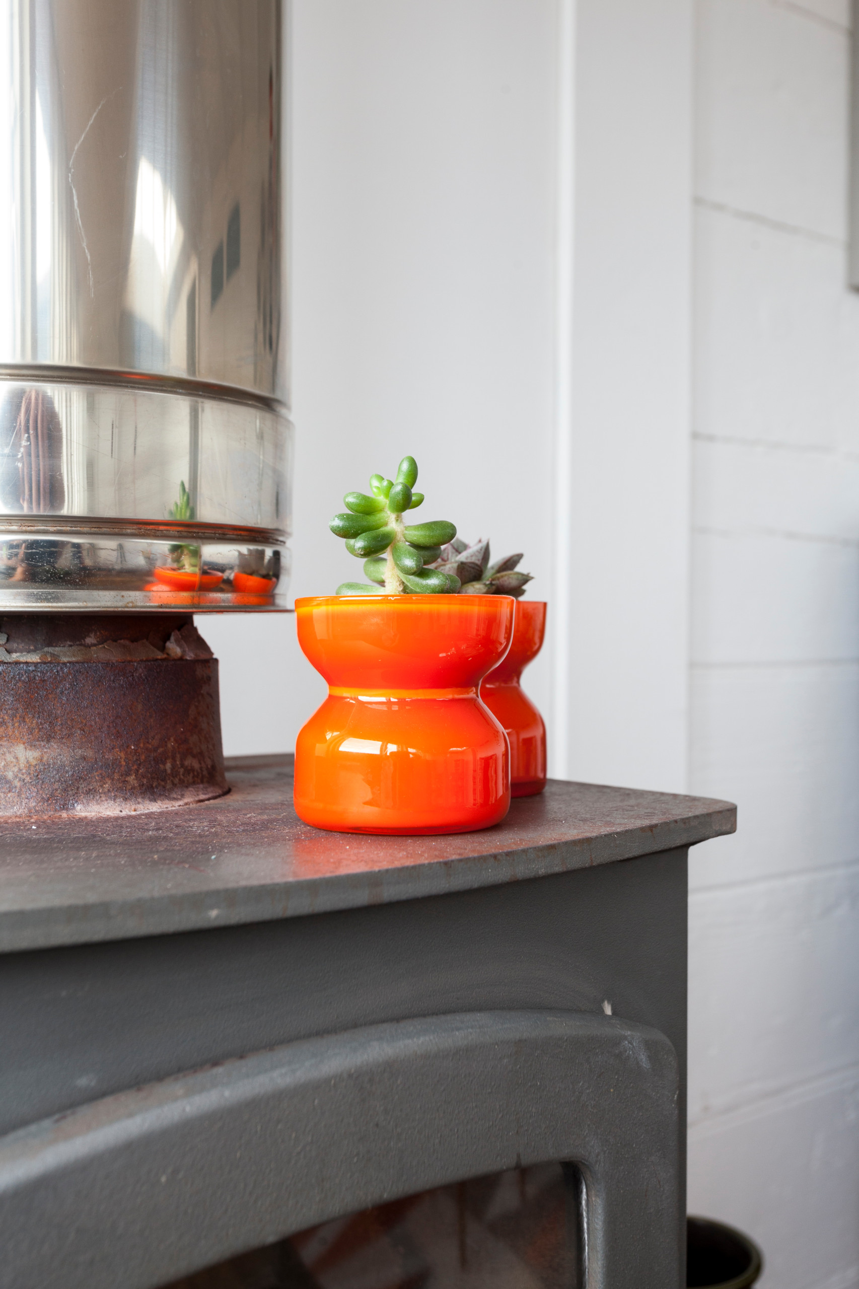 Il bello di coltivare delle piante piccole è poterle inserire praticamente ovunque. Questi vasetti arancioni sono in realtà contenitori di vetro per candele, qui trasformati in alloggio per mini piante succulente.