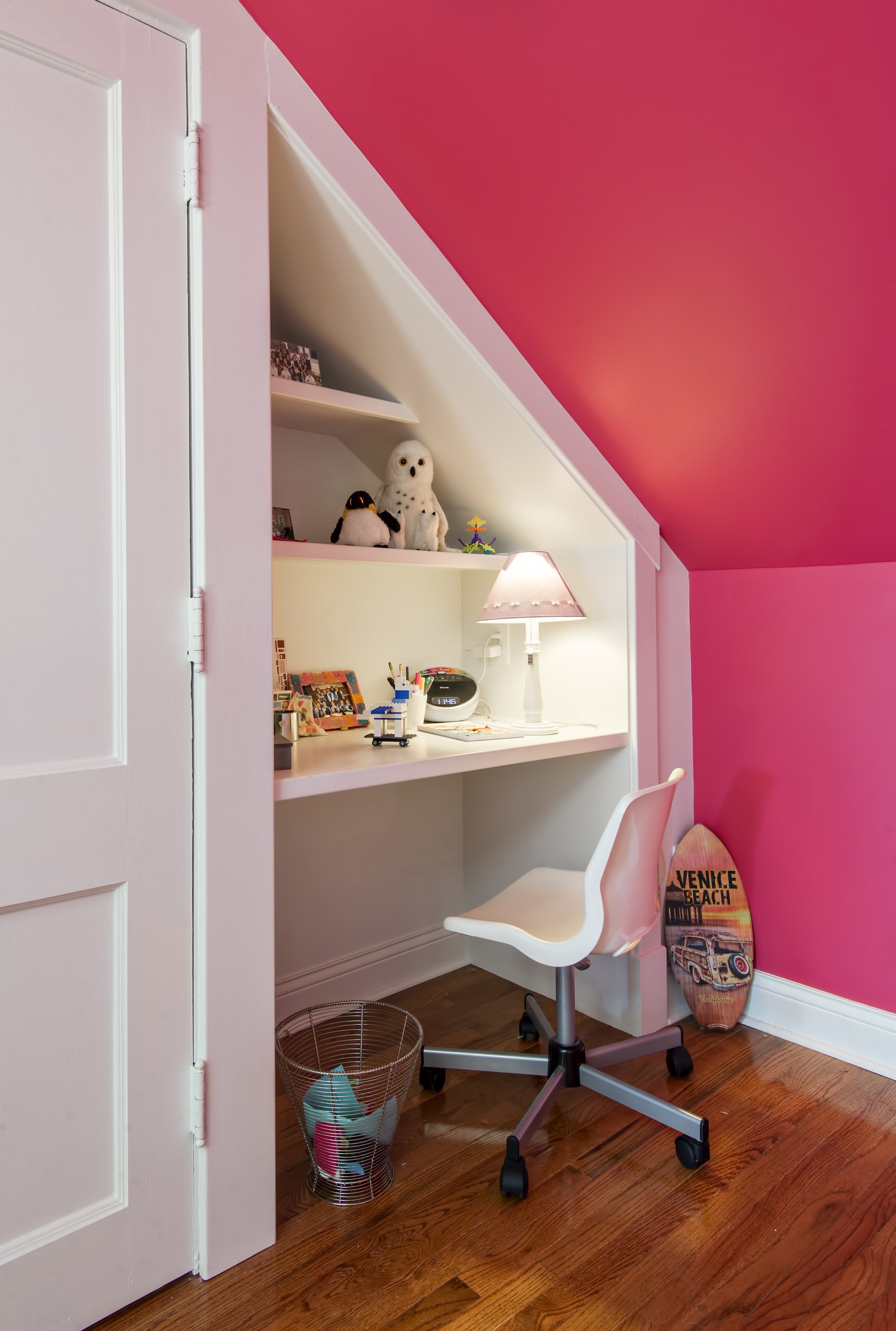 L’ultimo metro di una parete in mansarda si trasforma in una piccola ma graziosa scrivania in cameretta. Tinte chiare per sedia e mobili ti aiuteranno a ottenere luminosità.