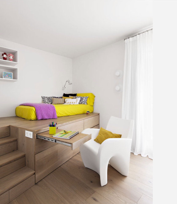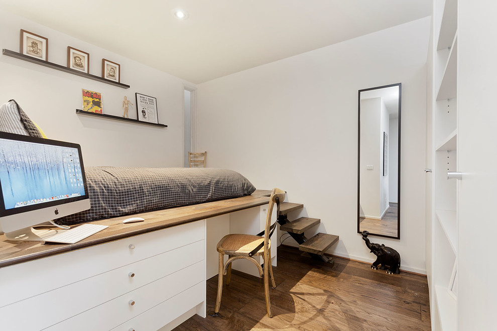 Tre gradini conducono all’area riposo mentre la parte esterna della base del letto può essere usata come comodino di notte e scrivania di giorno. Un banco forse un po’ stretto ma sufficiente per ospitare computer, mouse e tastiera. La cassettiera in basso aggiunge volume, rendendo la postazione più confortevole. Usando colori naturali, come il bianco e il legno, si ottiene una composizione armonica ed elegante, particolarmente adatta ai ragazzi.