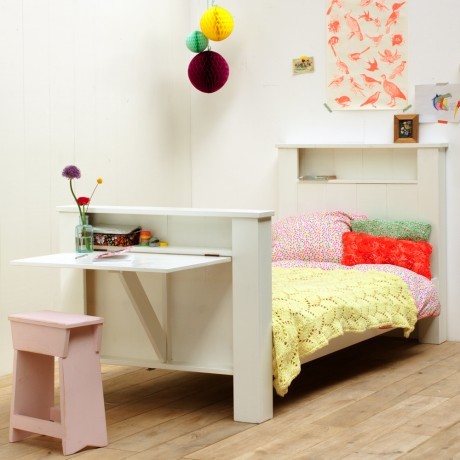 Ci sono letti fatti per dormire ma anche per studiare. Un elemento strategico ai piedi del letto si può impiegare come scrittoio. Il tavolo a ribalta si apre facilmente e compare solo quando serve, basta accostare uno sgabello ed è tutto pronto per iniziare a leggere, scrivere, imparare. La nicchia orizzontale che resta nel vano funge da ripiano per riporre astucci e quaderni.