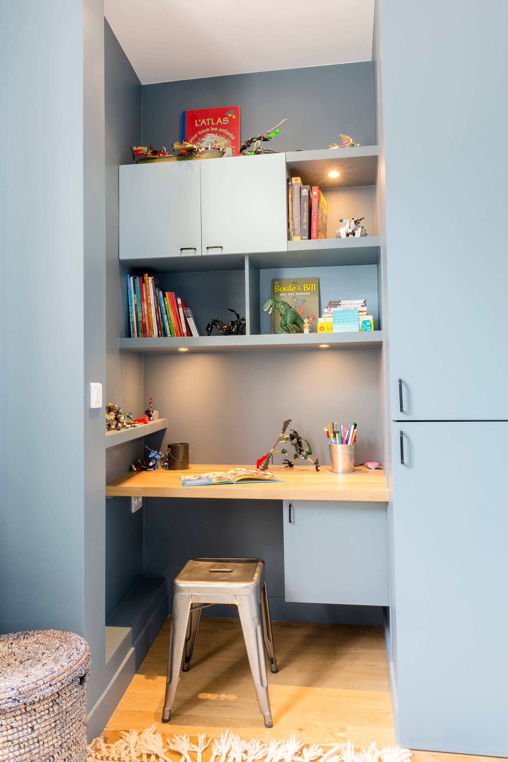 Se hai un vano inutilizzato in camera, puoi creare un angolo dove studiare. In questo caso, grazie alla profondità, è stato possibile posizionare il piano di lavoro internamente, creando una zona riservata. Se scegli la stessa tinta per mobili e parete – qui un sofisticato celeste polvere – puoi rendere questo posto perfettamente integrato con l’ambiente, attrezzato e funzionale.