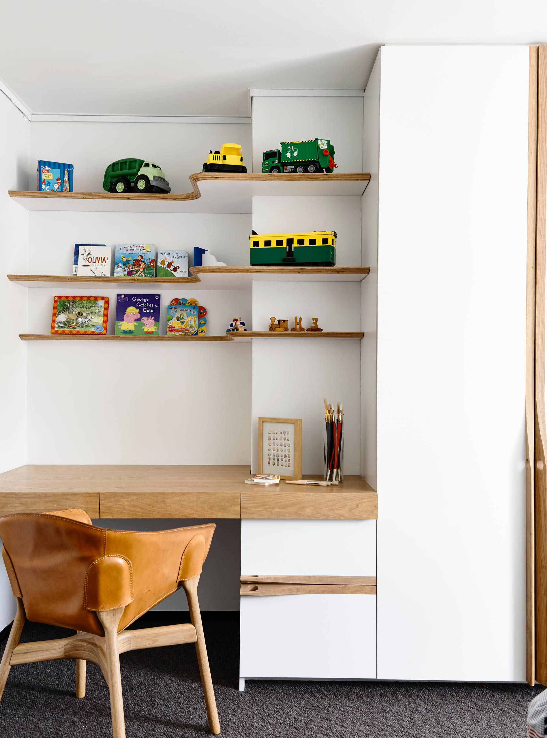Anche se risultano più costosi, gli arredi disegnati su misura consentono di guadagnare centimetri preziosi. Qui, ad esempio, il progetto segue l’andamento della parete diventando tutt’uno con l’armadio. I cassetti sono utili per conservare gli oggetti privati ma anche per liberarsi in fretta dal caos di astucci e matite.