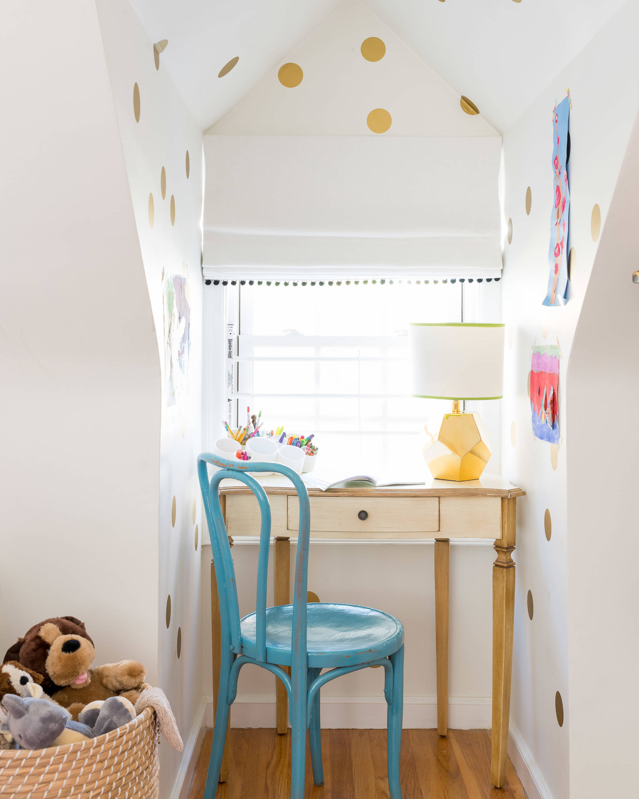 A volte basta solo un po’ di fantasia per risolvere i problemi di spazio. Questo tavolo di legno entra perfettamente nel vano della mansarda, illuminato da una grande finestra sul fondo. Con la decorazione a pois tutto risulta più allegro mentre la sedia in tinta pastello completa l’allure vintage.