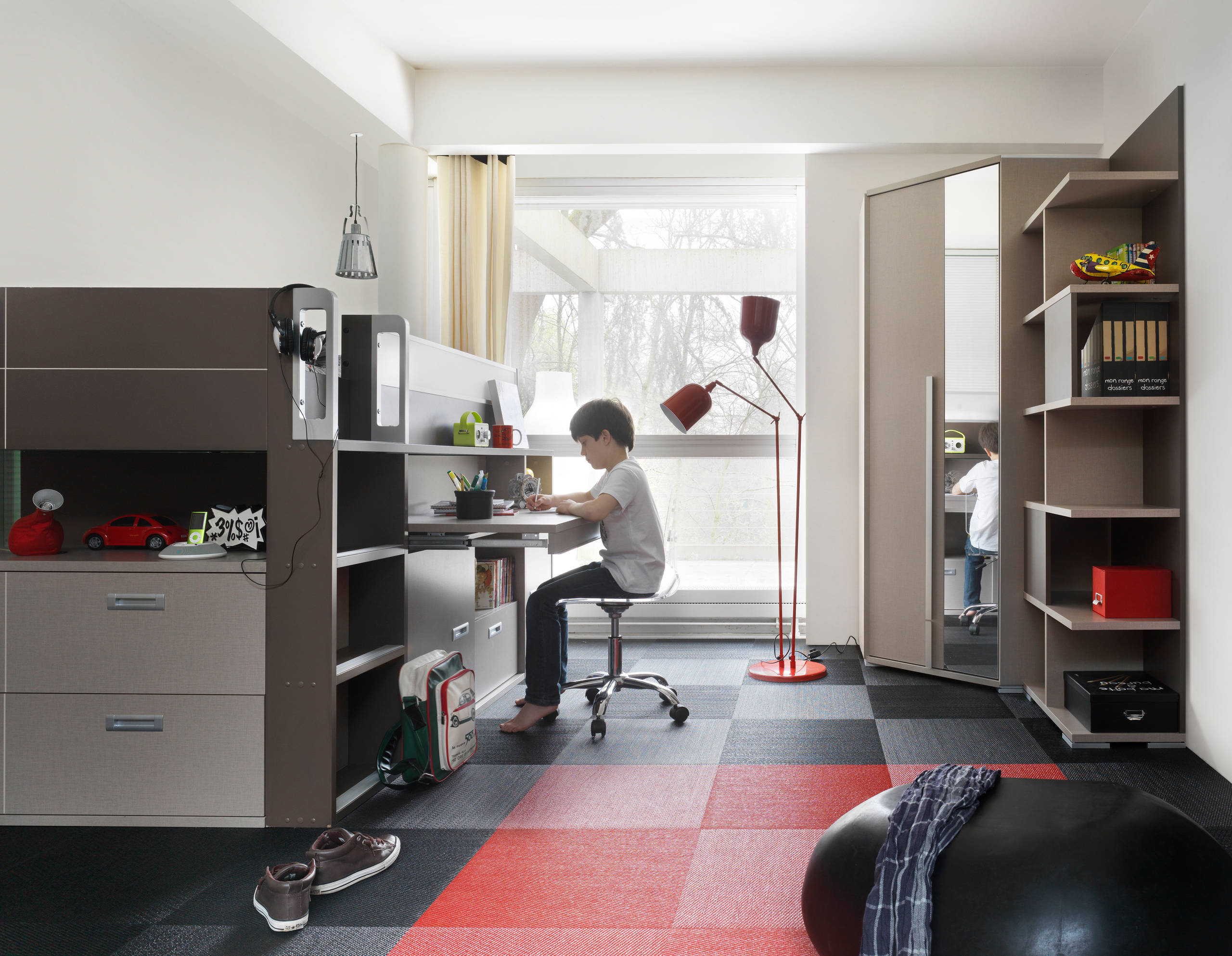 Tenere separate le aree gioco e quelle del relax aiuta a evitare facili tentazioni. Puoi optare allora per un’unica struttura che occupa una sola parete della stanza, contenendo letto a soppalco e scrivania a scomparsa, da tirare fuori come un semplice cassetto. Per essere riposto, il piano deve essere completamente libero e per questo ci sono vani aperti e cassettoni estraibili che completano il modulo e lo rendono dinamico e funzionale. Cerca di posizionare il mobile vicino alla finestra per avere una luce naturale che dia la giusta carica per migliorare le prestazioni.