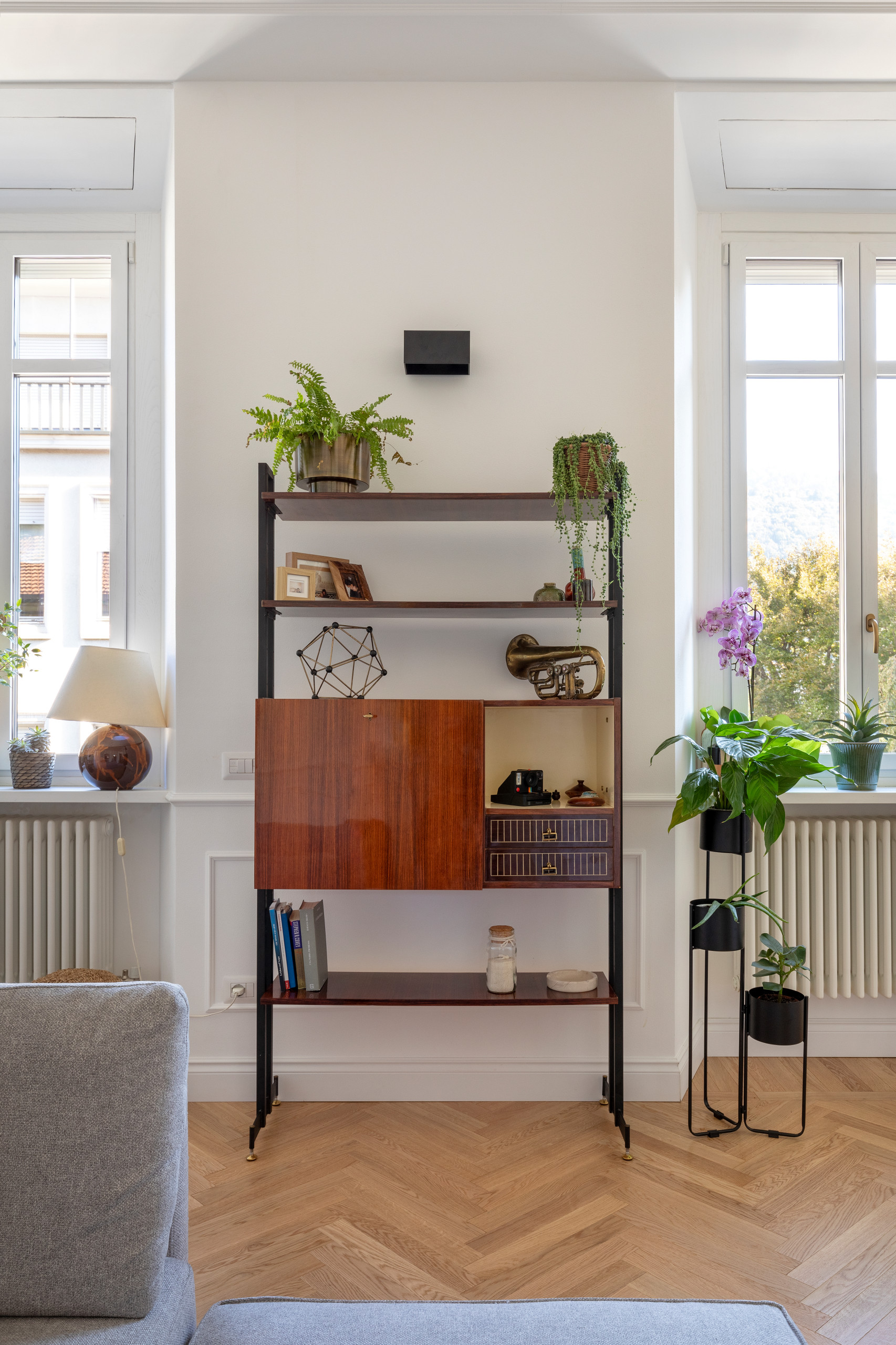 Da questa necessità, ad esempio, è nata l’idea di inserire arredi di modernariato: con forte personalità ma, grazie a un’accorta ricerca, costi contenuti. Come questa scaffalatura con elemento a ribalta, circondato di piante: i committenti hanno espresso il desiderio di portare la natura dentro casa.