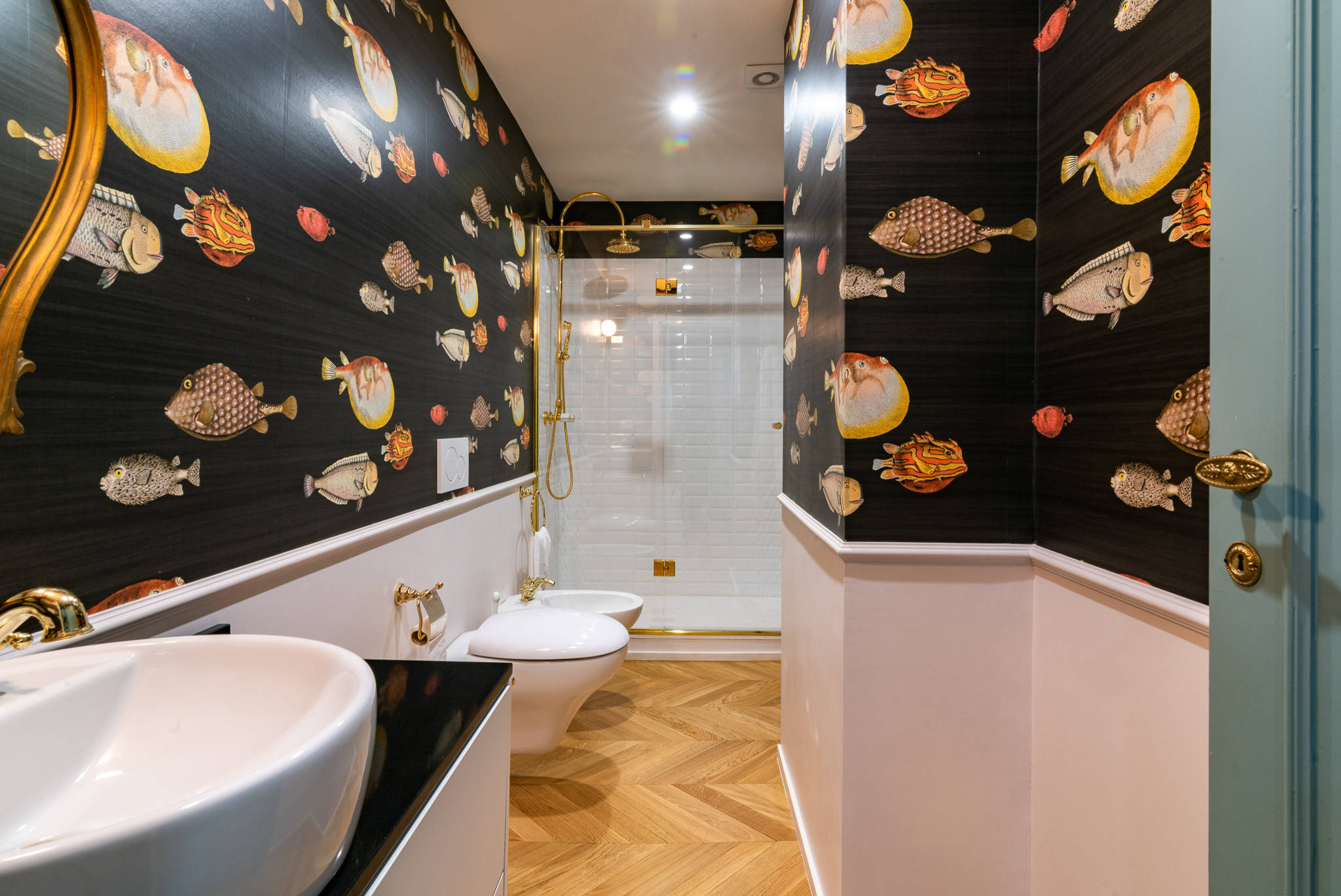 Una soluzione meno pratica ma molto decorativa è quella della carta da parati, che trasforma il bagno rendendolo accogliente, allontanando quell’atmosfera a volte fredda e troppo tecnica del bagno classico.