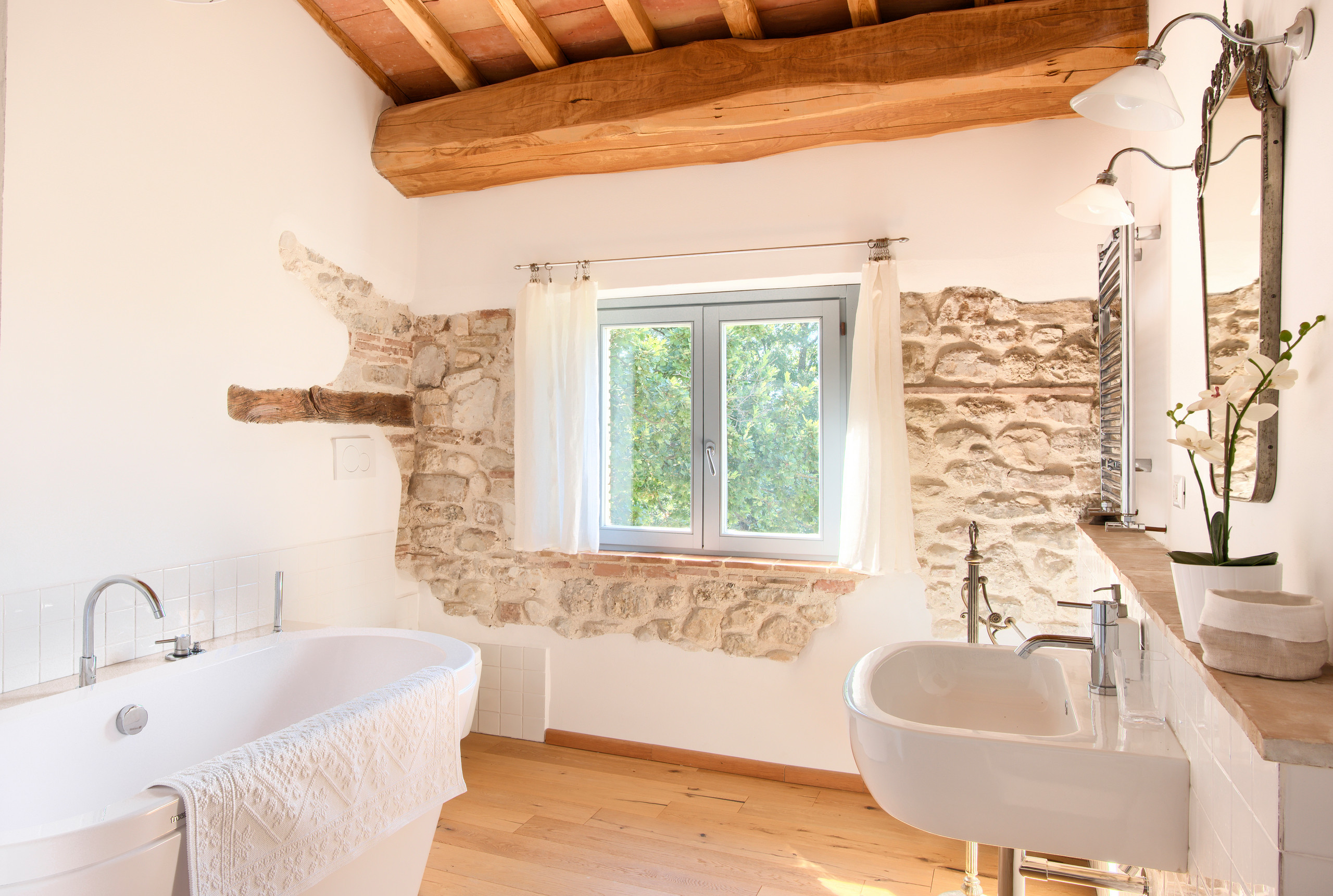 Il bagno in stile rustico è accogliente ed evoca la lentezza della vita di campagna. In chiave classica è un mix di pietra, legno e arredi semplici. Adatto a una casa che sposa questi materiali anche negli altri ambienti. Meno adatto a un’abitazione dallo stile complessivo più urbano e moderno.