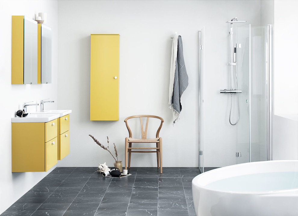 Il bagno in stile scandinavo unisce funzionalità e comfort. Un elemento tipico di questo stile è la doccia a pavimento, ricorrente nei bagni scandinavi. Ed elementi in legno, come la sedia in questa immagine, che riscaldano l’atmosfera.
