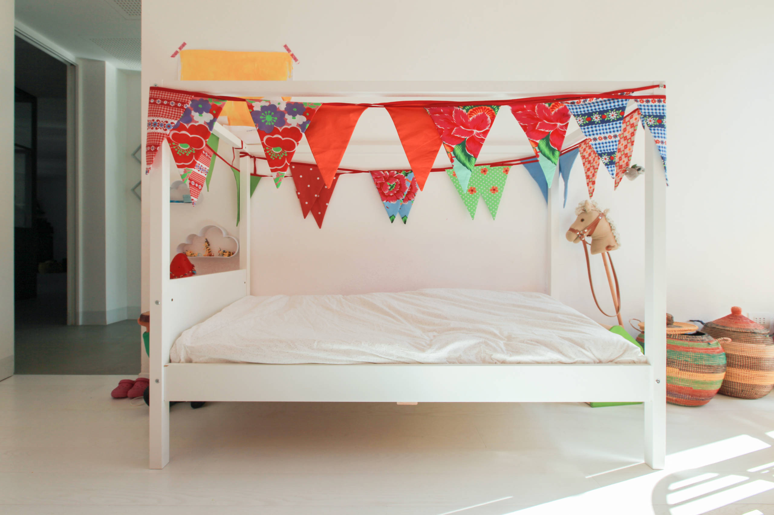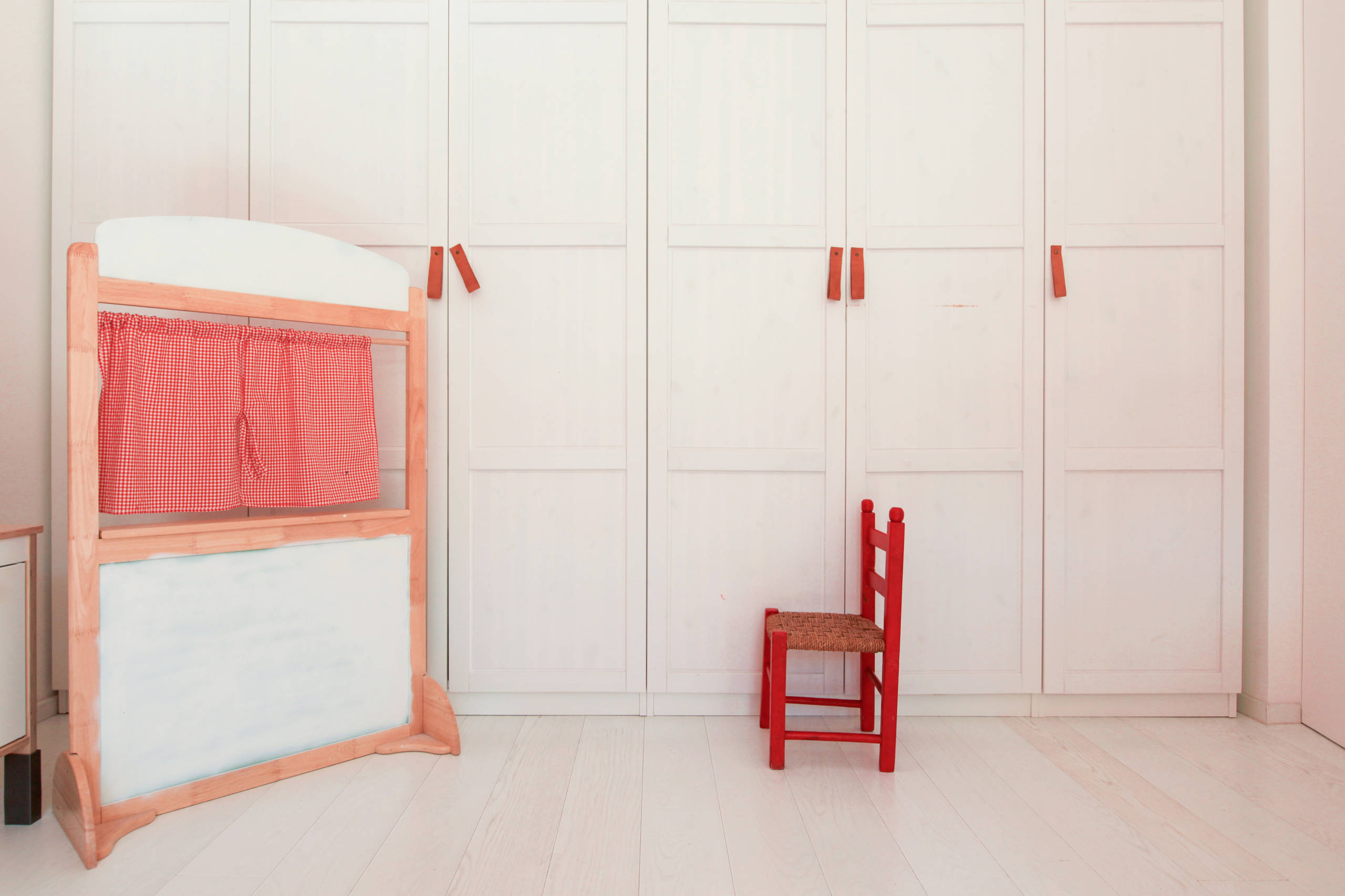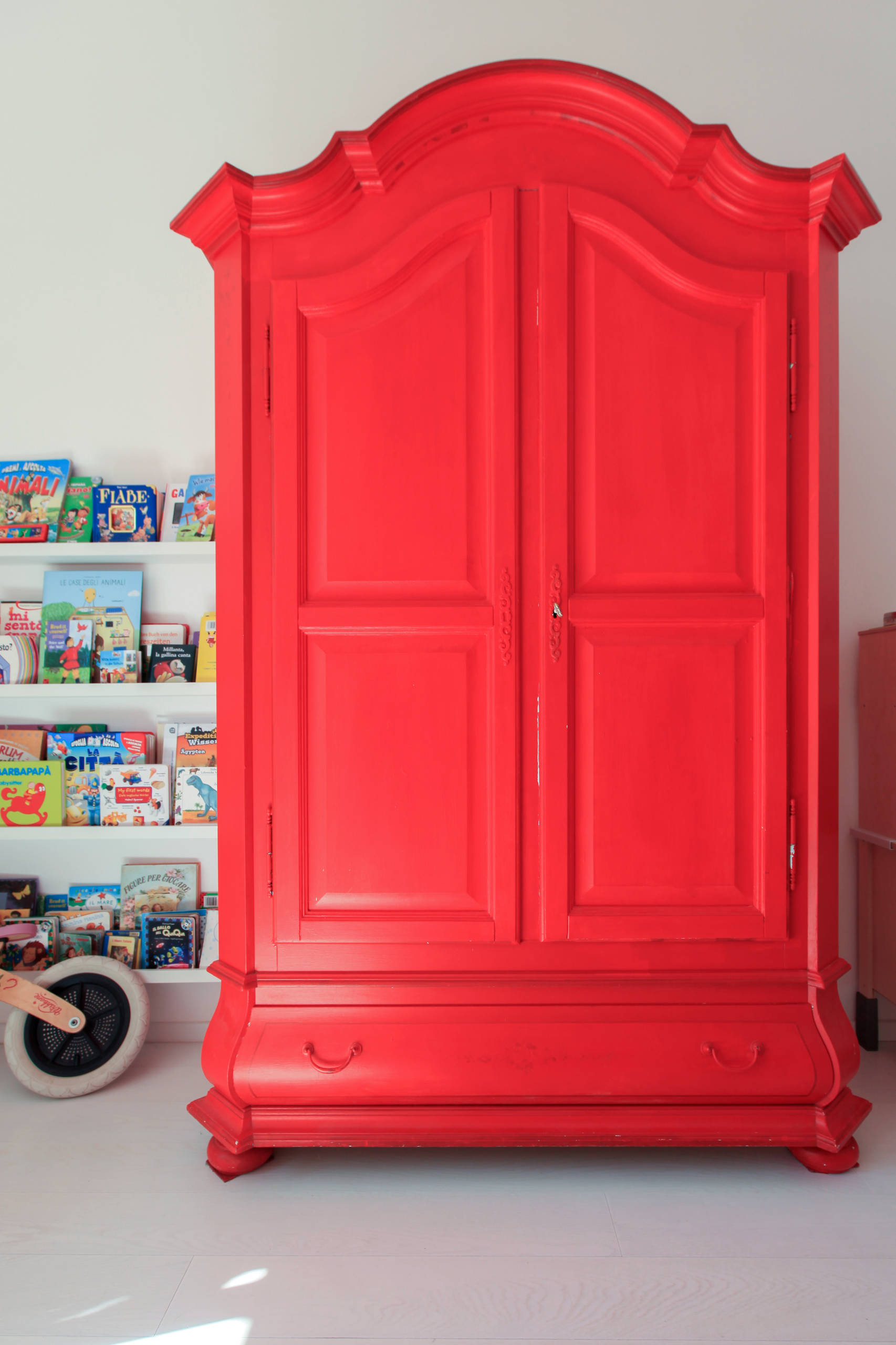 In mezzo ai giochi e ai libri, la luce del sole sottolinea il contrasto di colori vivi immersi nel bianco prevalente di letto, armadio e parquet. Di fronte al letto di Selvaggia c’è uno splendido armadio rosso. «Alcuni mobili che abbiamo sono stati recuperati. Lo spirito con cui abbiamo pensato la casa è proprio questo. Cercare soluzioni belle, non necessariamente costose, e sistemare ciò che può essere utilizzato secondo il nostro gusto. Nel caso di questo armadio, era di un altro colore e con decorazioni che non mi piacevano, ho preferito colorarlo di rosso», dice Daria.