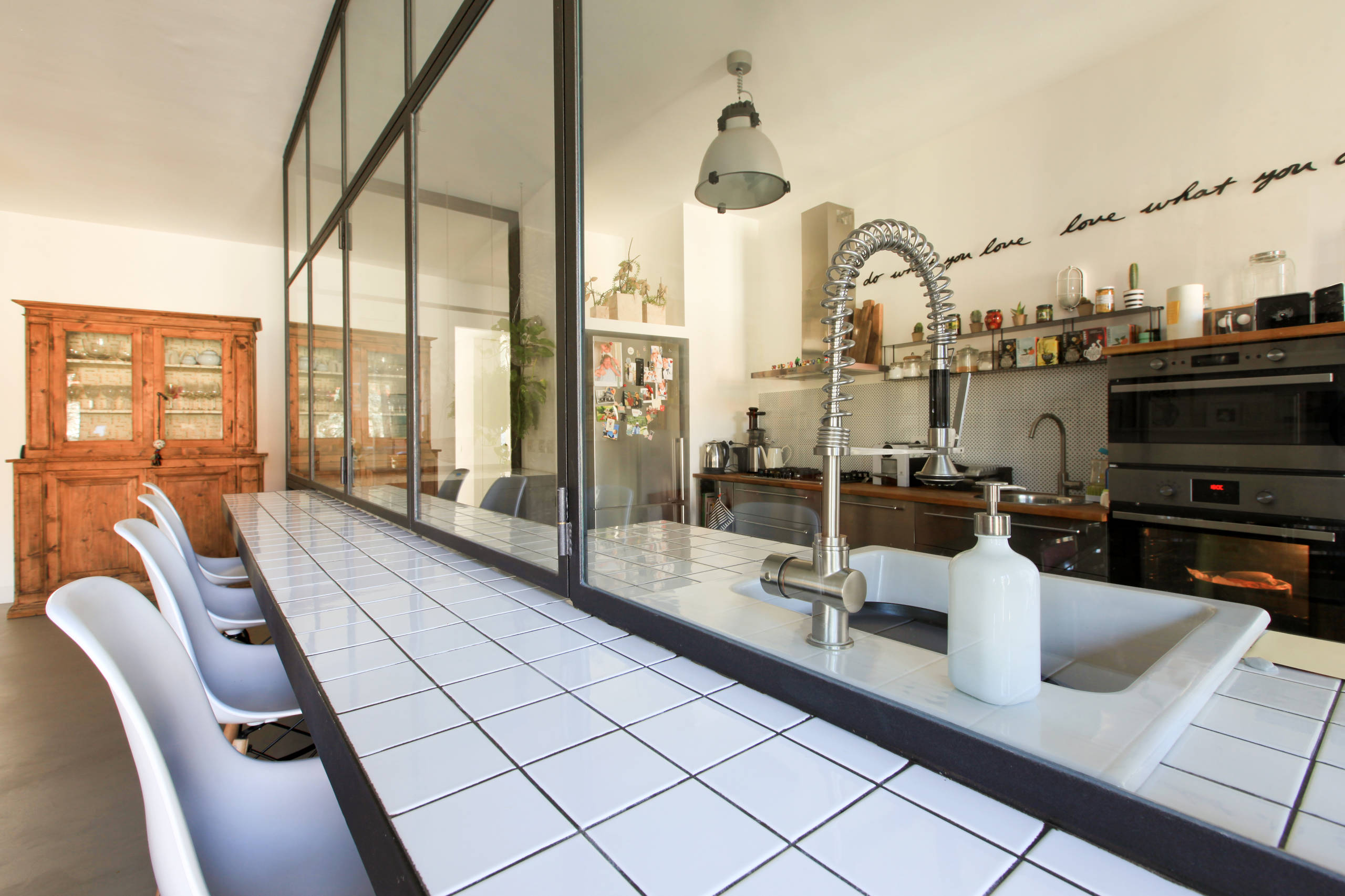 La cucina a vista è impreziosita da una splendida struttura in ferro e vetro, costruita su misura con aperture richiudibili secondo le necessità. «Ci piaceva l’idea di poter delimitare la cucina lasciandola a vista. Con Carlotta abbiamo pensato che l’idea migliore fosse riuscire a realizzare qualcosa che consentisse di separare gli spazi, senza sacrificare la luce e comunque mantenendo l’ampiezza degli ambienti», raccontano Daria e Pietro.