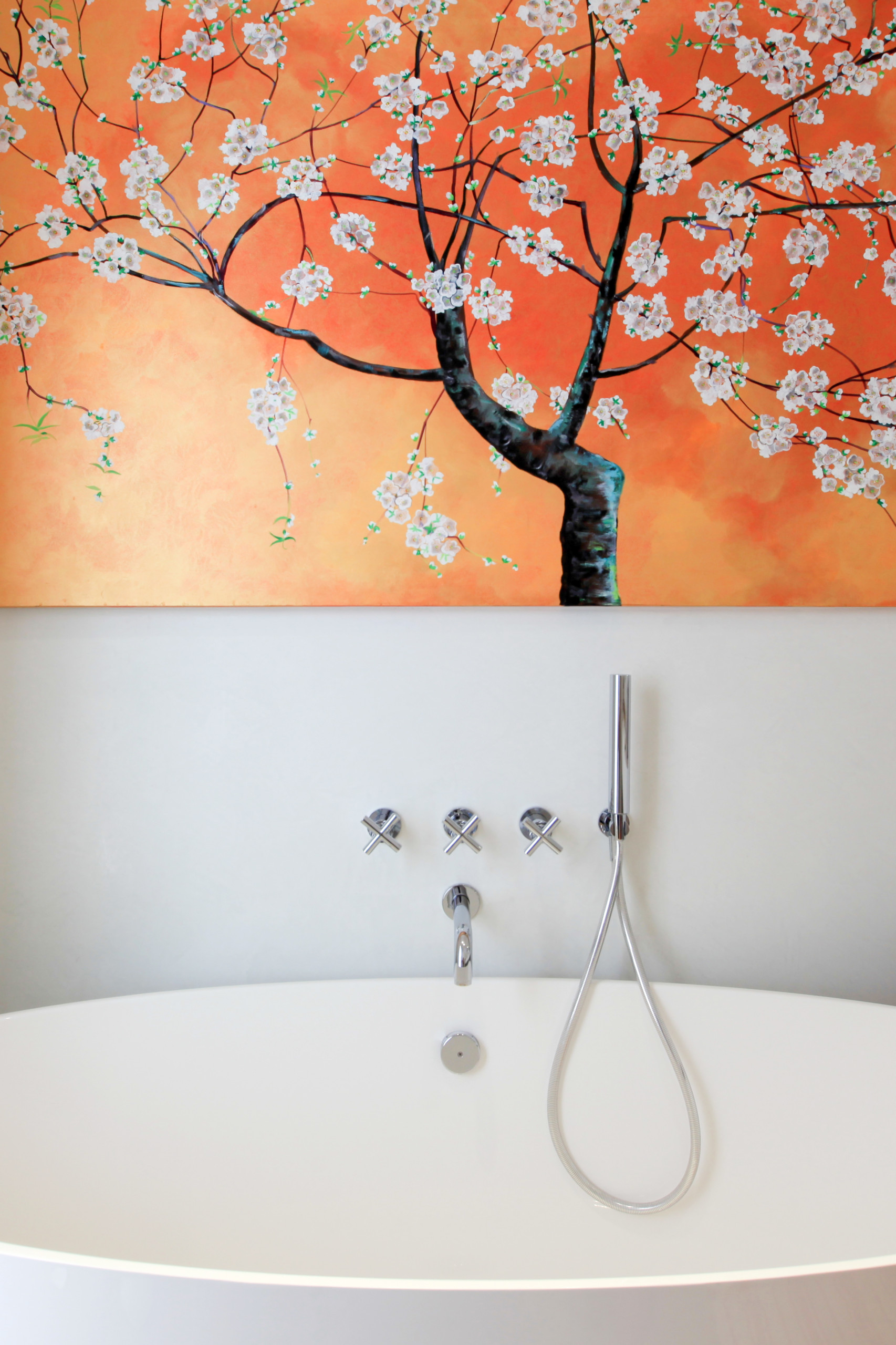 «Questo invece è già il bagno di Selvaggia, praticamente di fronte a quella che sarà la sua nuova stanza. In questo modo a Rocco e Matteo rimarrà il bagno in comune in mezzo alle loro camere e Selvaggia avrà il suo. Mi piaceva l’idea di arricchirlo con qualcosa di molto colorato. L’opera è un olio su tela dell’artista Rita Mangano. È specializzata nel realizzare opere per gli ospedali pediatrici, le sue creazioni sono sempre piene di colori e illuminano davvero gli ambienti».