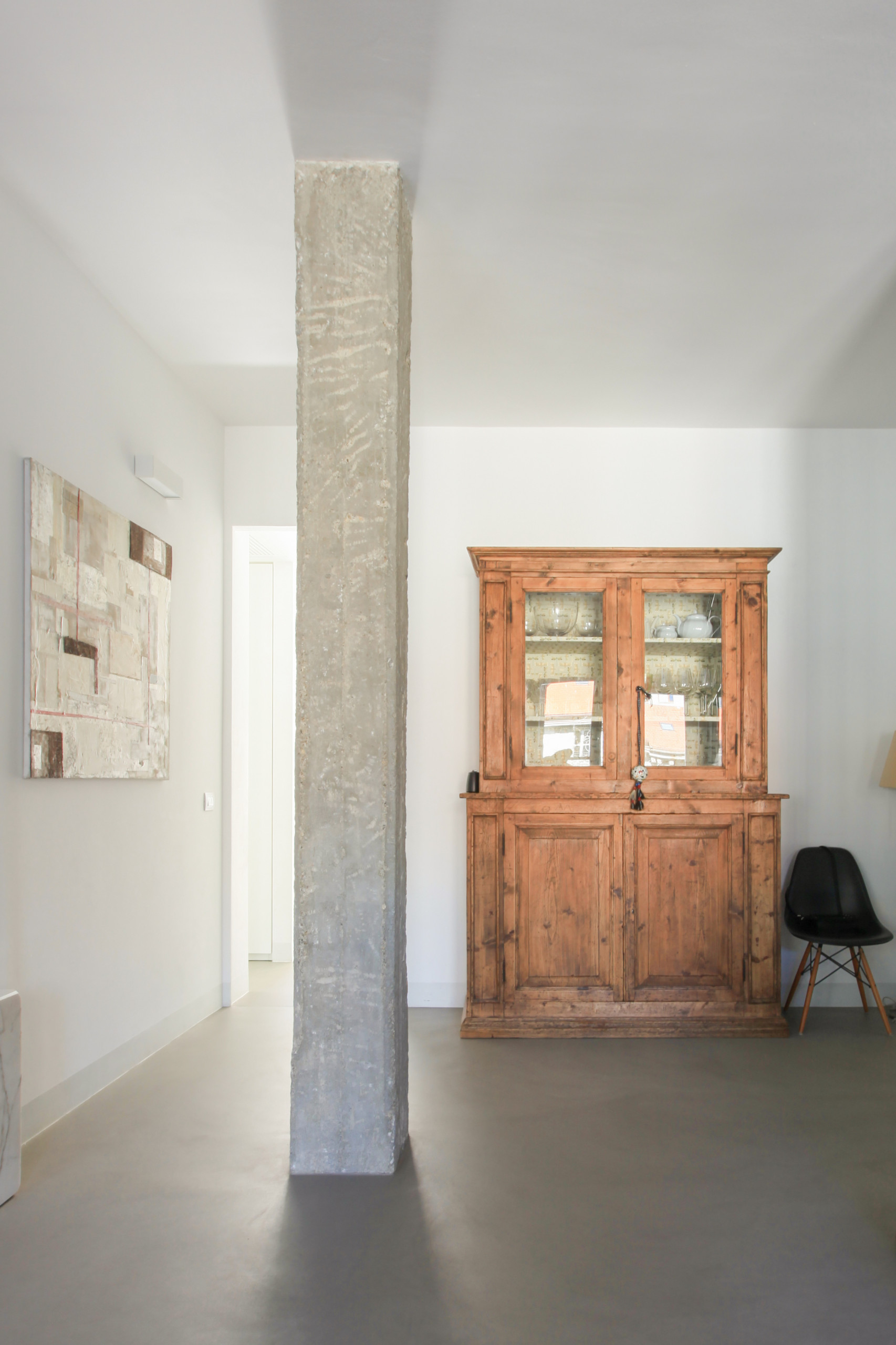 All’ingresso dell’area living svetta una colonna portante in cemento: «Come in tutte le case, anche in questo appartamento ci sono molte colonne portanti. Qui c’era un corridoio, la colonna era parte del muro. Una volta scoperta, da subito ho pensato che mi piaceva così. Poi però è stata comunque rifinita e rasata. Era perfetta e più grande a causa dell’intonacatura, ma appena l’ho vista durante i lavori ho chiesto che la riportassero allo stato originale: mi piace grezza», spiega Daria. La colonna porta i segni dei lavori eseguiti, ed è effettivamente bellissima così.