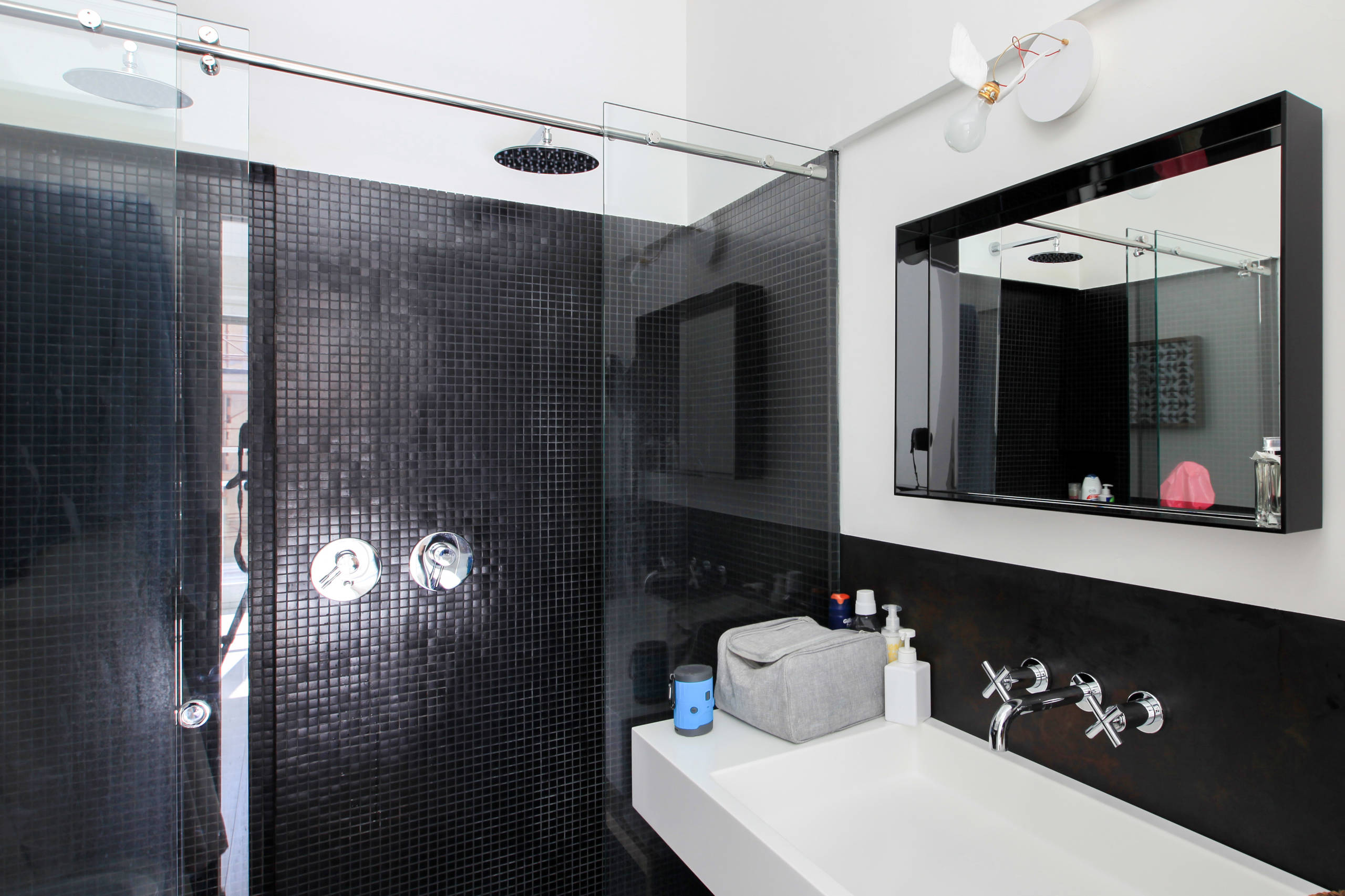 Rubinetteria: Da-Da di Zazzeri; lampada a parete: Lucellino di Ingo Maurer; specchio: Only Me di Kartell, design Philippe Starck; mosaico nero: mosaico+