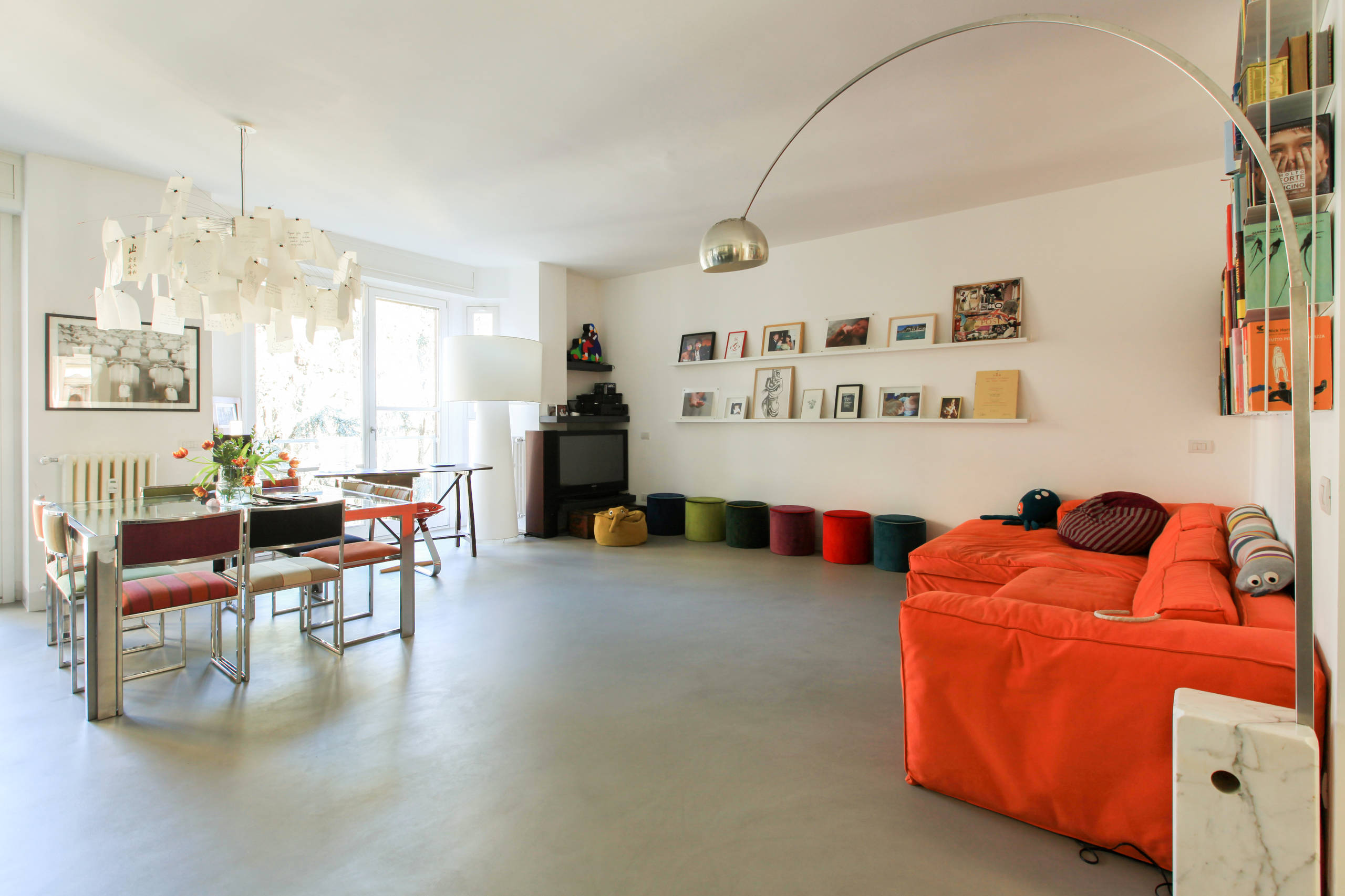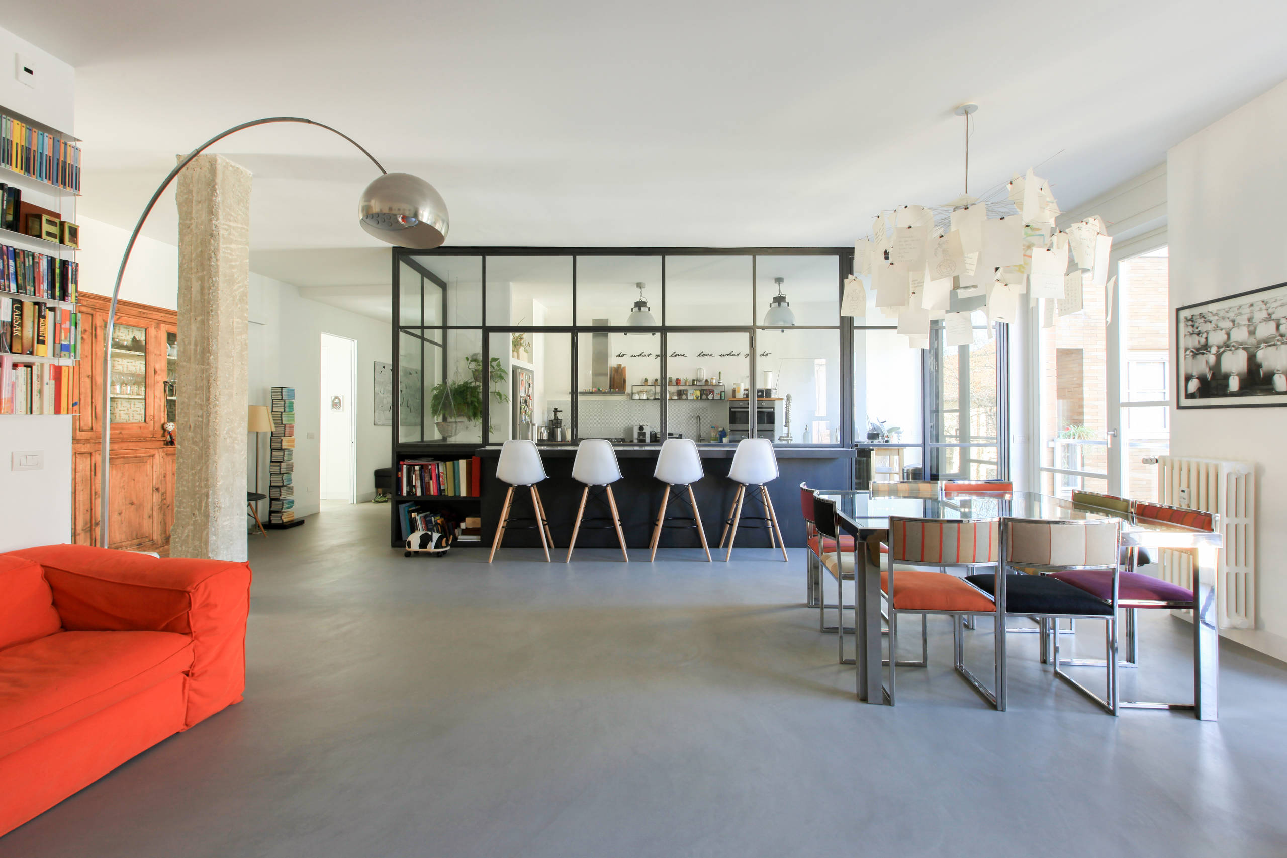 Nell’area giorno, per la pavimentazione si è scelto di usare una miscela di cemento e resina (PerfectCombination di HD Surface), ferro e vetro per creare lo spazio cucina, luminosissimo e perfettamente integrato nel soggiorno. La scelta di materiali industriali appare in perfetto equilibrio con l’arredamento che include molti pezzi di design, tra cui la lampada Arco di Flos e la lampada Zettel’z di Ingo Maurer.