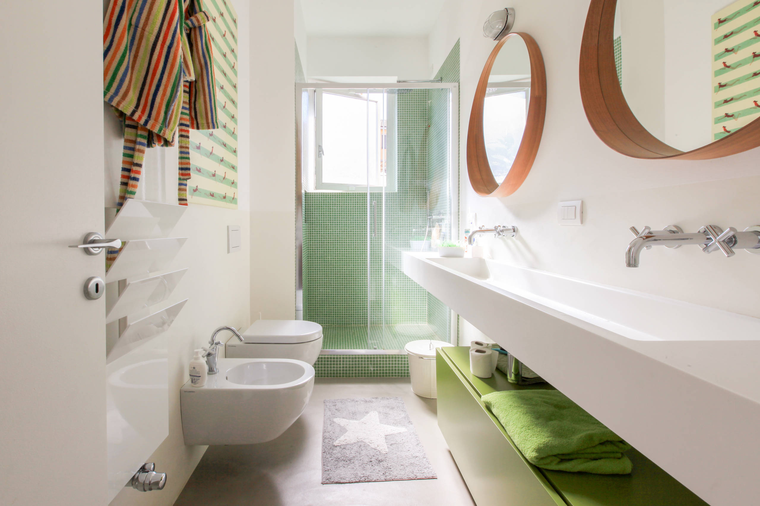 Tra la stanza di Selvaggia e quella di Matteo e Rocco si trova uno dei tre bagni di casa. «Matteo e Rocco condividono questo bagno. Quando abbiamo ristrutturato la casa, eliminando il corridoio centrale e ripensando l’intera struttura, abbiamo creato queste mini unità interne (le camere dei bambini con bagni annessi) che consentono non solo di separare l’area notte da quella giorno, ma anche di ricreare spazi indipendenti per ognuno di loro».