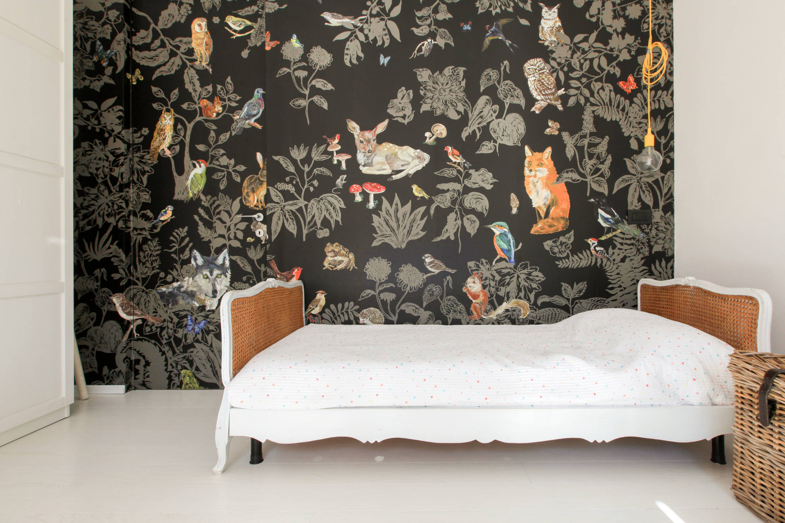 Lampada a sospensione: E27 di Muuto, design Mattias Ståhlbom; carta da parati: Forêt Noire di Domestic, design Nathalie Lété