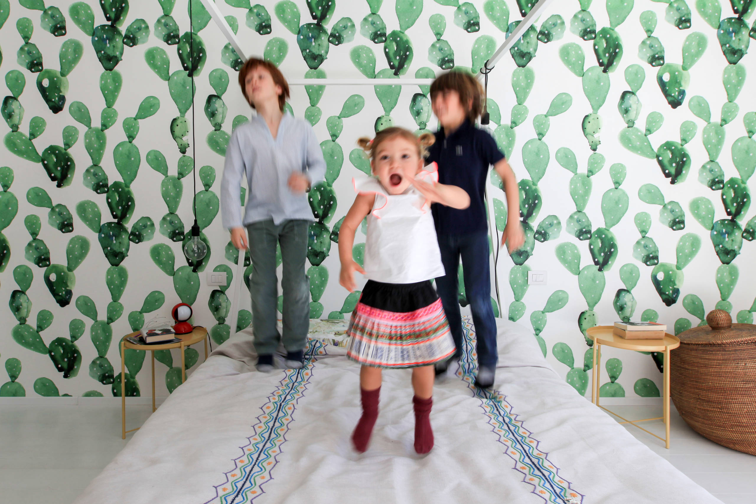 Nel frattempo, la vita di casa scorre com’è giusto che sia quando ci sono tre bimbi pronti a tutto. Una sessione di salti sul letto di mamma e papà non può mancare. Mentre lasciamo i bambini ai loro giochi, torno con Daria e Pietro in soggiorno.