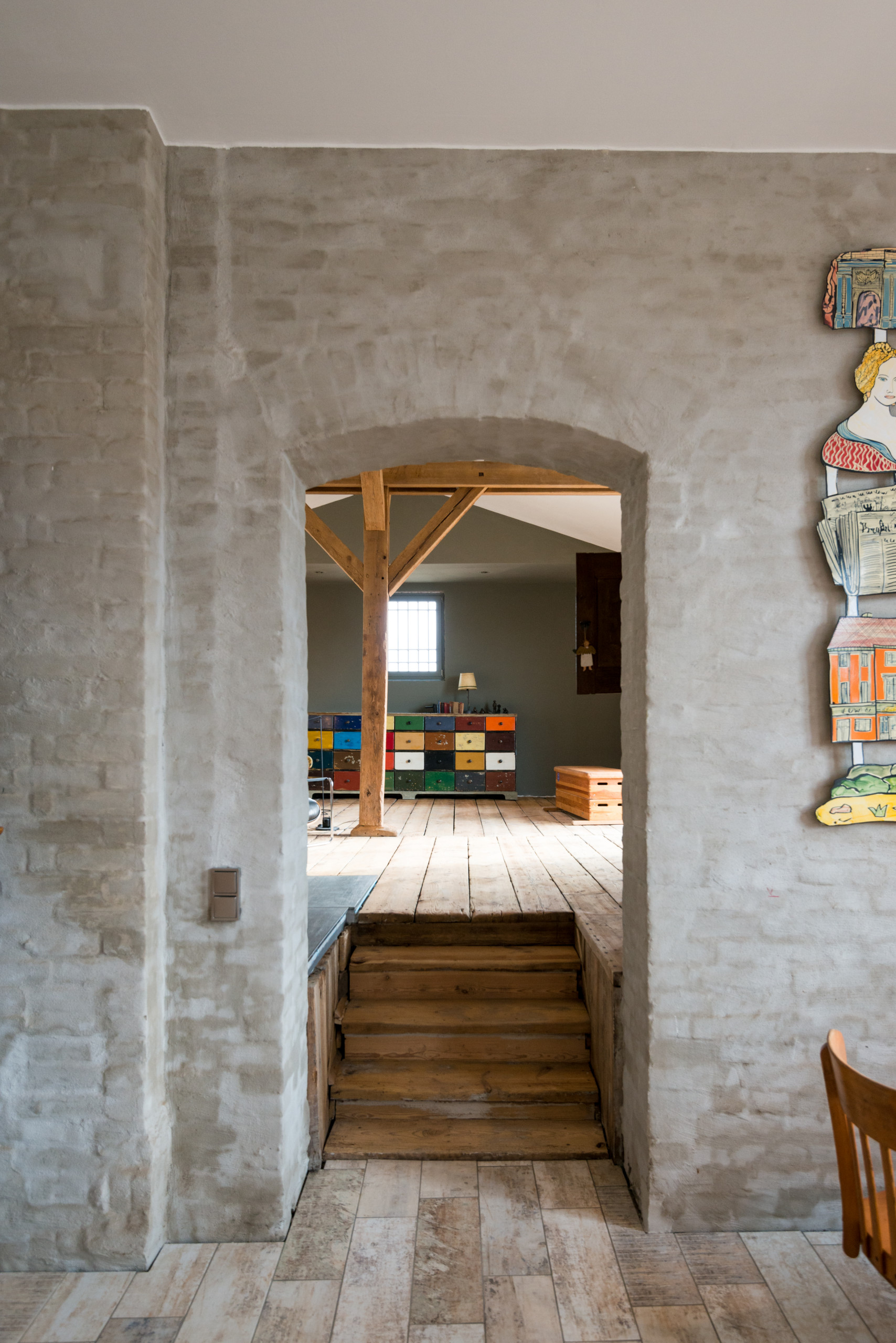 Sulla parete non passa certo inosservata l’opera d’arte di grande formato: «È stata realizzata in smalto dall’artista Moritz Götze nostro amico», spiega Stephanie. «Ha rappresentato Fontane, il famoso scrittore che un tempo ha vissuto a Neuruppin».