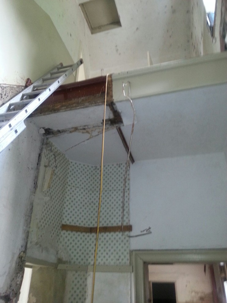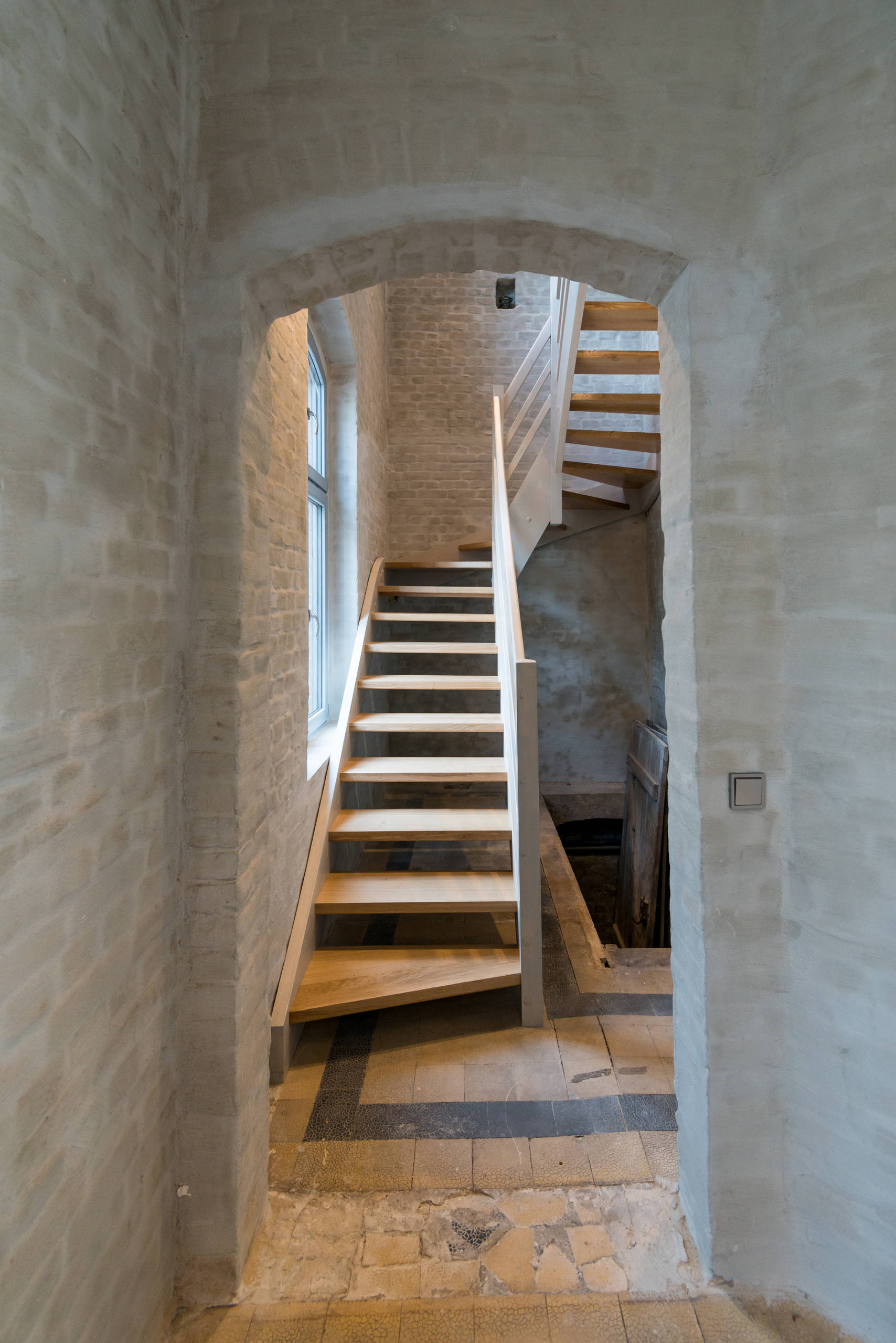 DOPO. Dal corridoio si può vedere il nuovo arco della porta che dà sulla nuova tromba delle scale. «Abbiamo voluto mantenerla quanto più aperta possibile». Scendendo le scale, si raggiunge lo scantinato che è ancora in fase di costruzione. «Non sappiamo ancora quello che faremo».