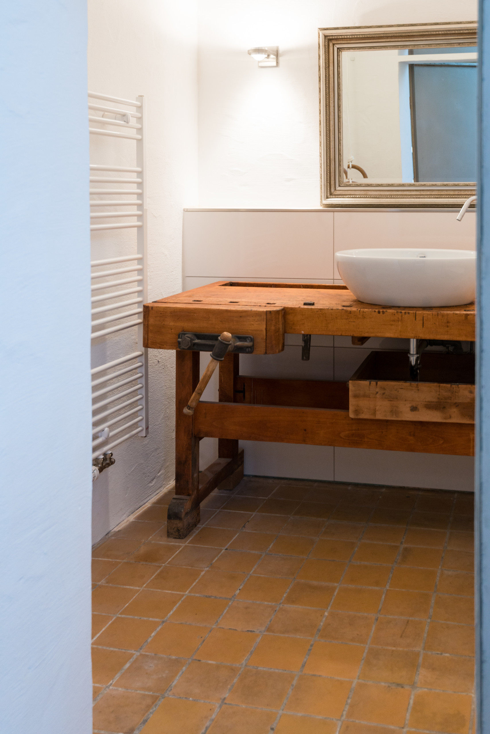 Il bagno degli ospiti è raggiungibile dal corridoio. Un vecchio banco da falegname è stato convertito in mobile da lavabo. «Ne ho un modello simile anche nel mio loft a Berlino. Quando ho trovato su Houzz questa ispirazione rustica, ho capito che non ho un cattivo gusto», ride Stephanie raccontando questa scelta.