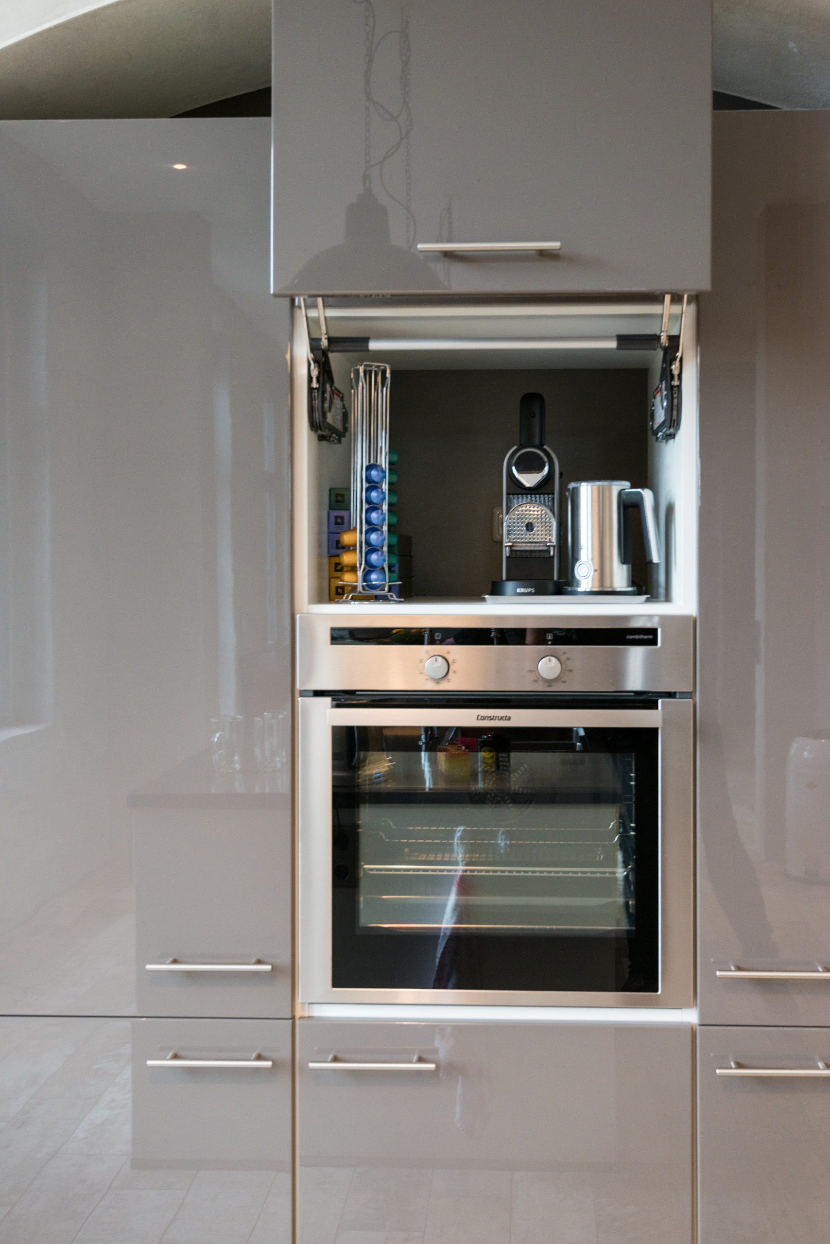 I frontali lucidi della cucina componibile di Nobilia riflettono la luce naturale in tutta la stanza. Negli armadi non sono riposte soltanto le stoviglie, ma anche la macchina da caffè e gli altri apparecchi, in modo tale da fare apparire la cucina più in ordine.