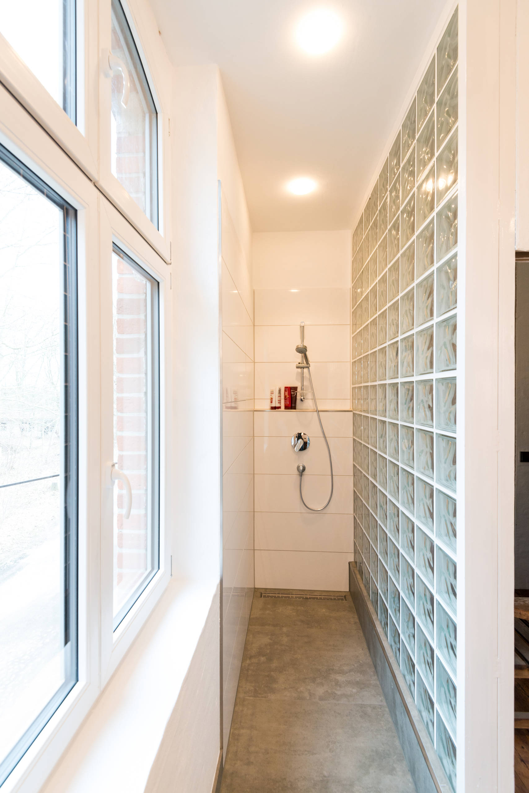 La parete della doccia a filo del pavimento è realizzata in vetro cemento per consentire alla luce naturale di illuminare il corridoio. «Le piastrelle del pavimento sono in gres porcellanato marrone, che si intona bene con il rustico mobile da lavabo. Sulle pareti sono state posate piastrelle larghe 90 centimetri, per avere una quantità minore di fughe e donare al bagno un aspetto moderno».