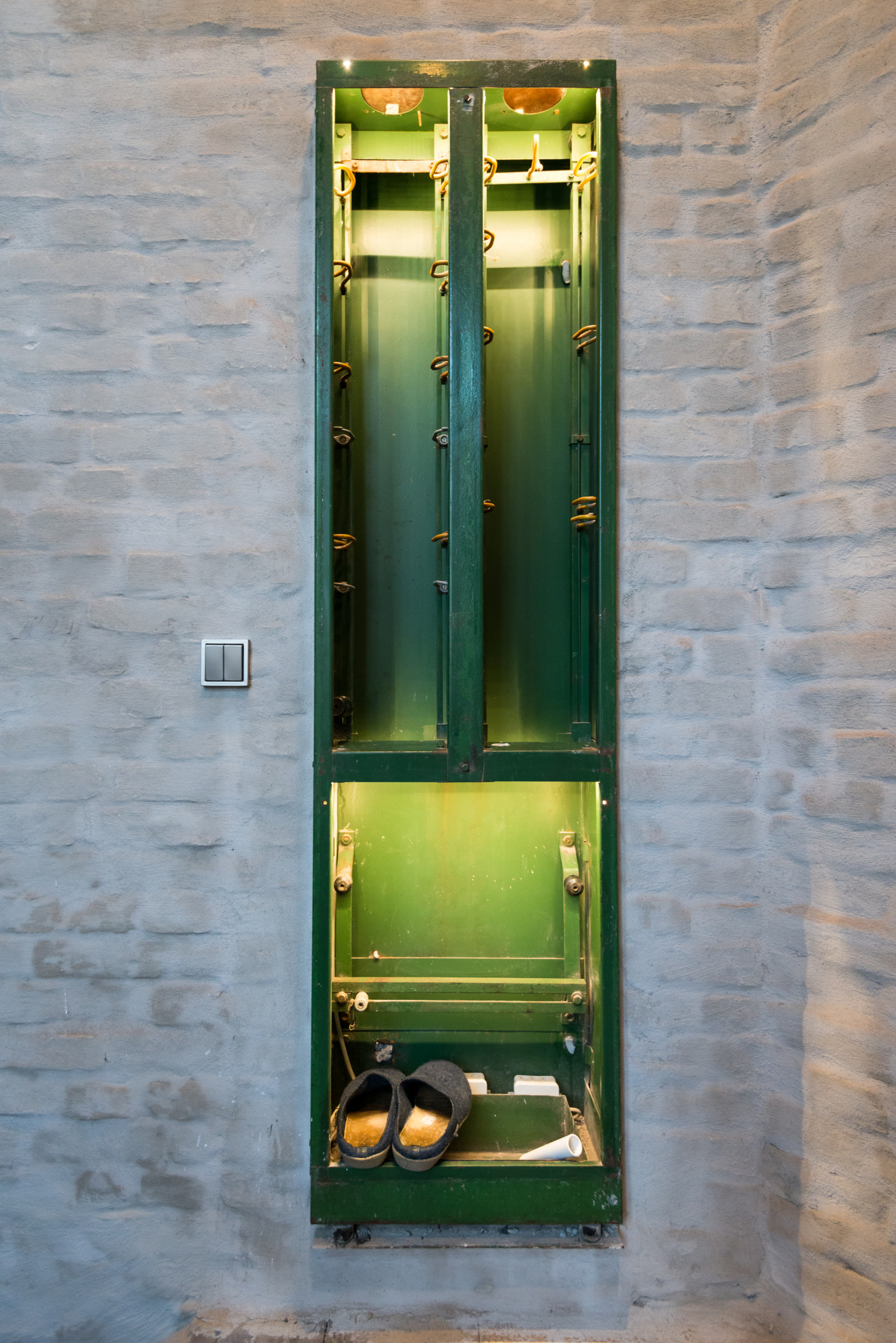 In una parete della tromba delle scale, la proprietaria creativa ha fatto installare questo vecchio quadro elettrico di colore verde della stazione. «Vorrei aggiungere dei ripiani in vetro per poterlo usare come scaffale».