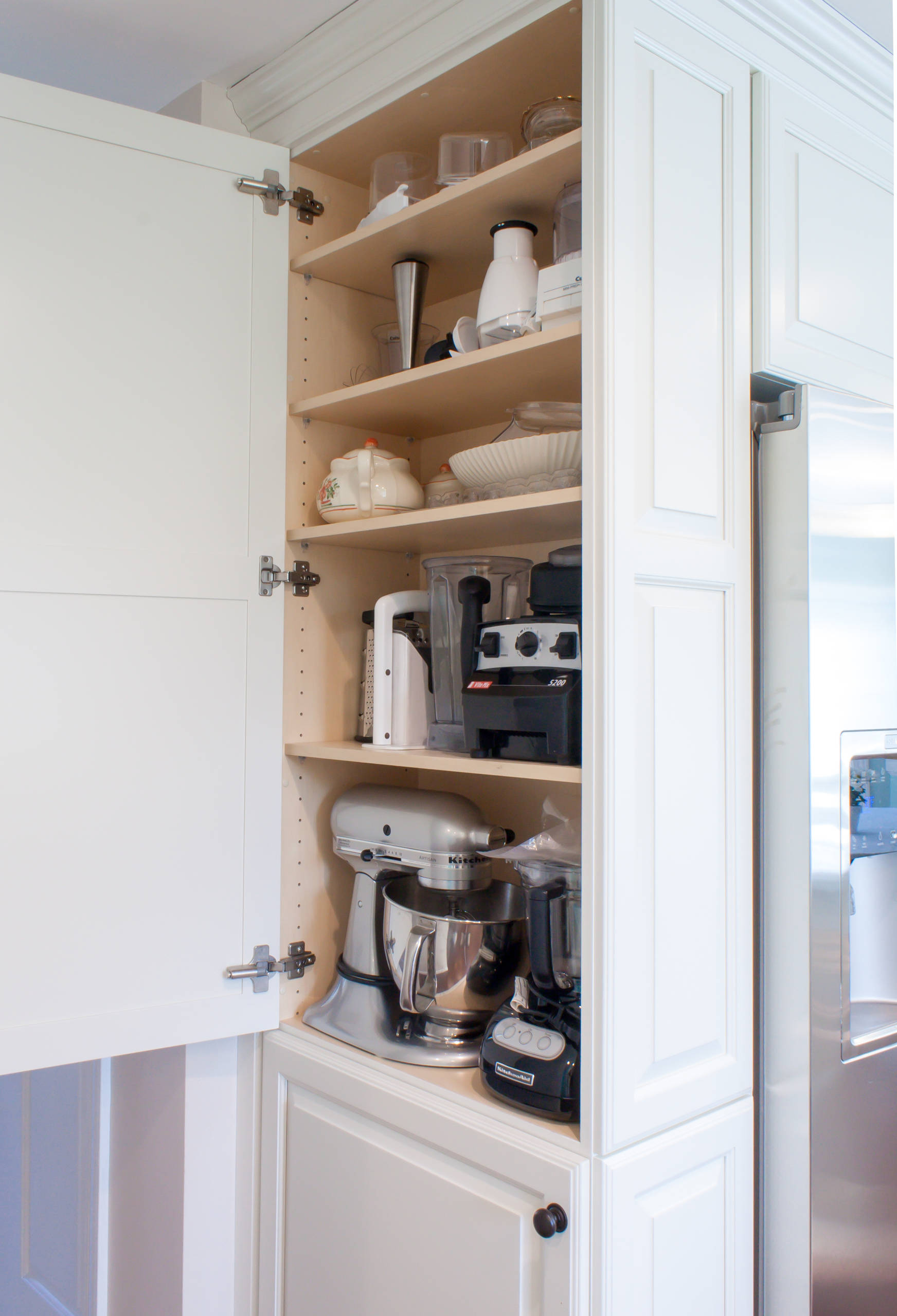 Se state progettando una nuova cucina, e possedete molti piccoli elettrodomestici, potete pensare anche ad una colonna completamente dedicata con vani di diverse dimensioni dove riporre il mixer o il tostapane una volta finito di utilizzarli. Dotatela anche di qualche congegno che vi aiuti a raggiungere le parti più alte.