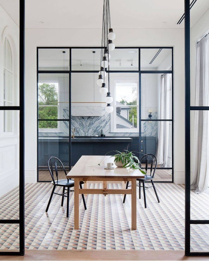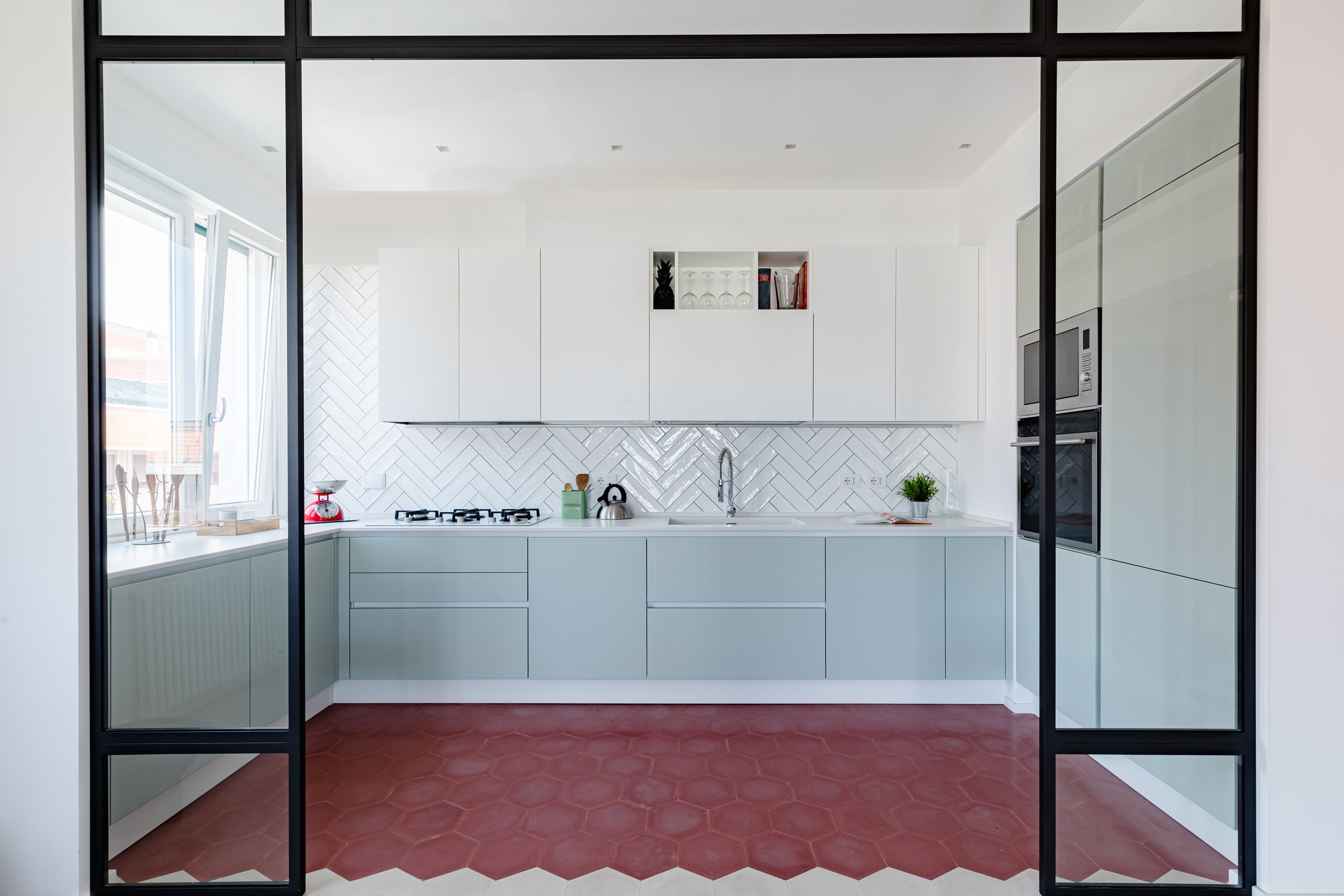 Per enfatizzare il senso di separazione visiva tra cucina e sala da pranzo, in questo progetto si è deciso di diversificare anche la pavimentazione. I frontali della cucina si abbinano alle cementine esagonali e alle sospensioni che cadono sul tavolo da pranzo. La vetrata dialoga invece con l’infisso della finestra.