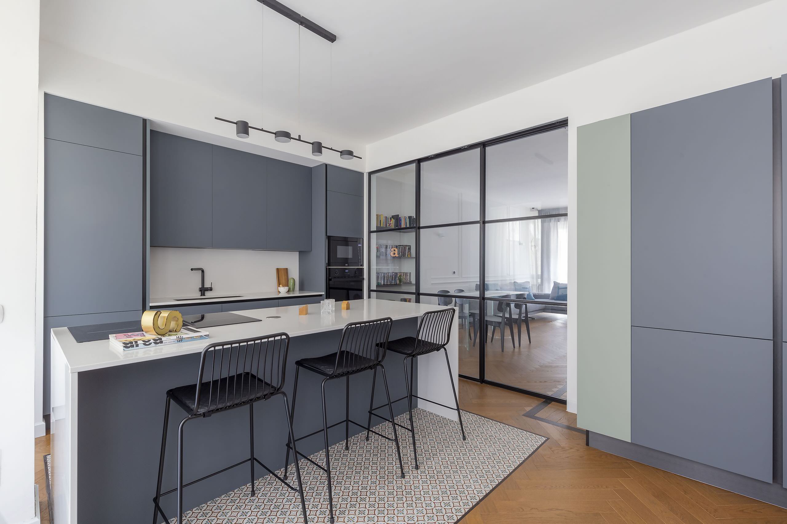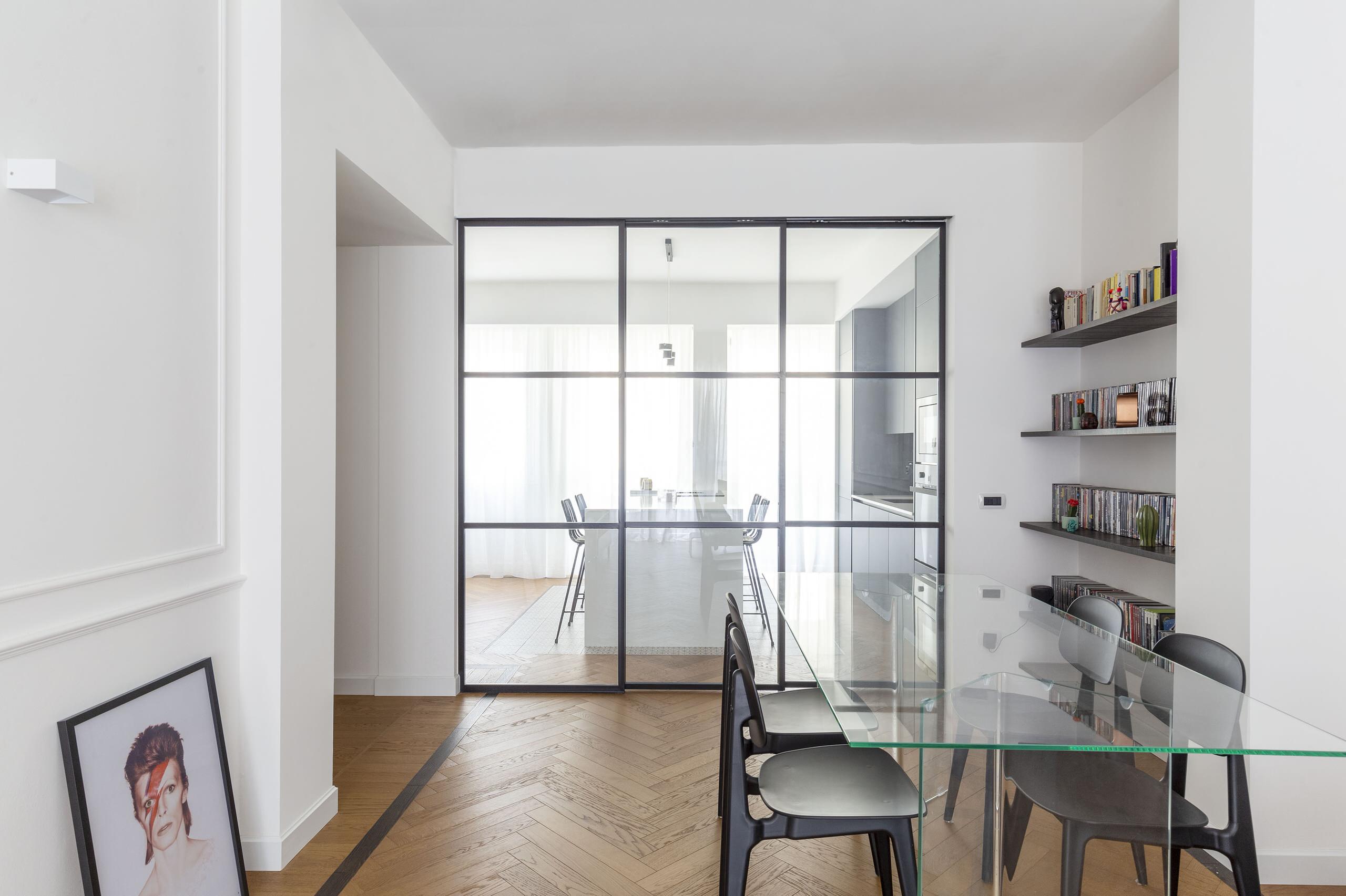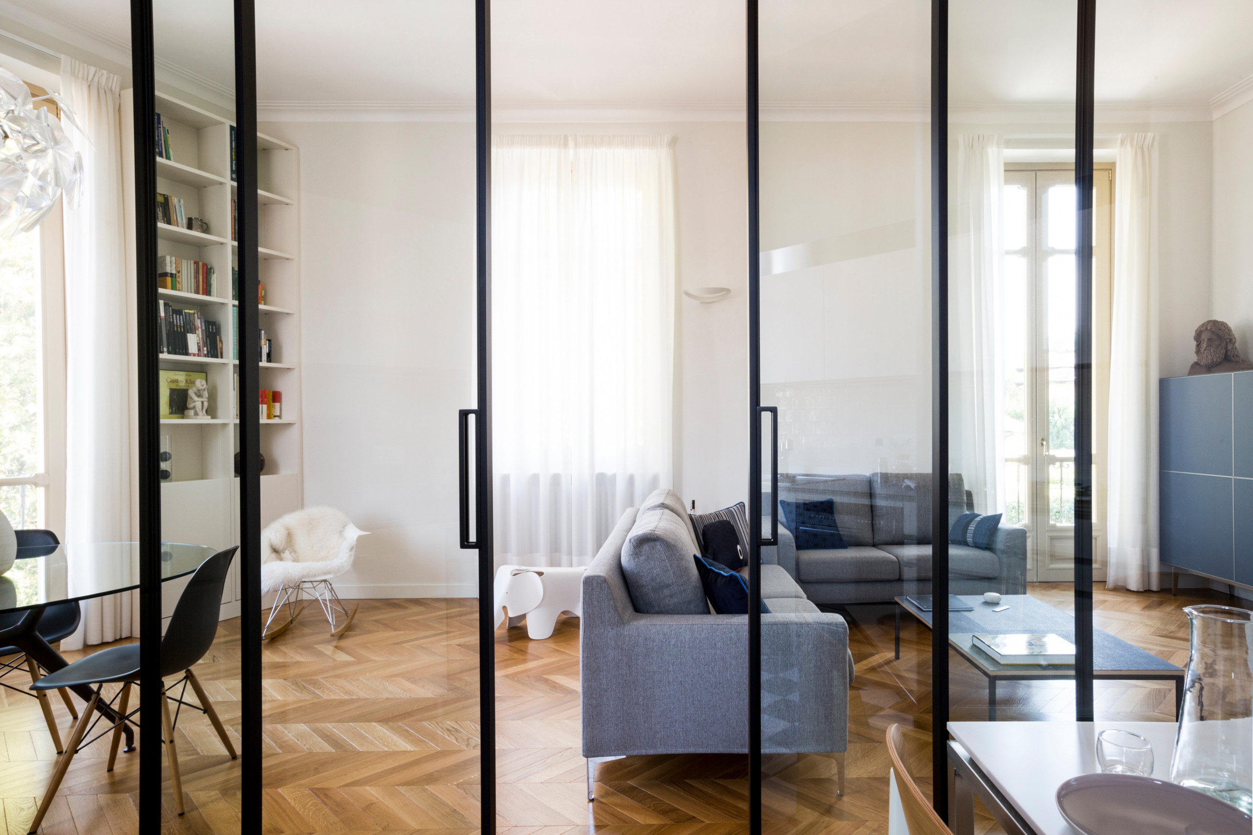 Una vetrata scorrevole rende più contemporaneo questo appartamento di inizio Novecento in cui il passato dialoga con il presente, in un reciproco scambio di intenti.