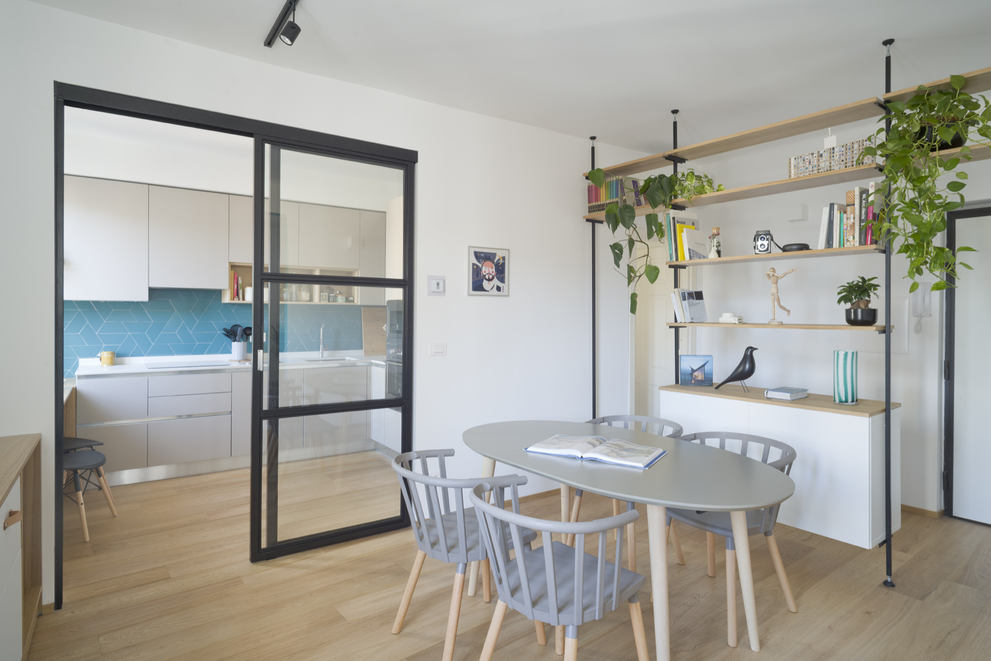 In questo piccolo appartamento, un’ampia porta scorrevole in ferro e vetro separa all’occorrenza la cucina dal resto della casa. Per creare continuità tra i vari spazi è stato realizzato un arredo polifunzionale e mono-materico che nasce in soggiorno come scrivania e mobile TV, attraversa la zona pranzo con una seduta sottofinestra e continua in cucina come piano per la colazione.
