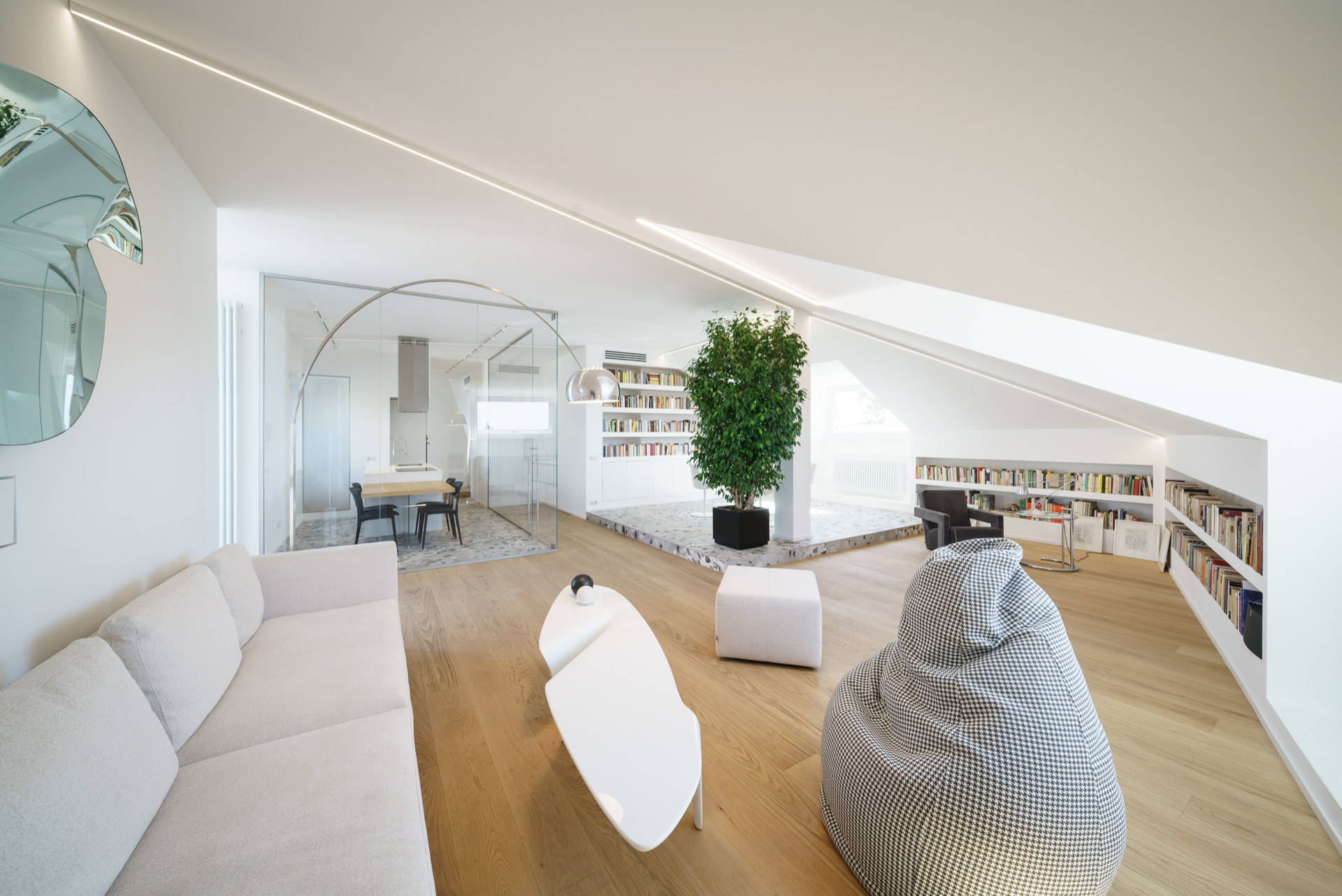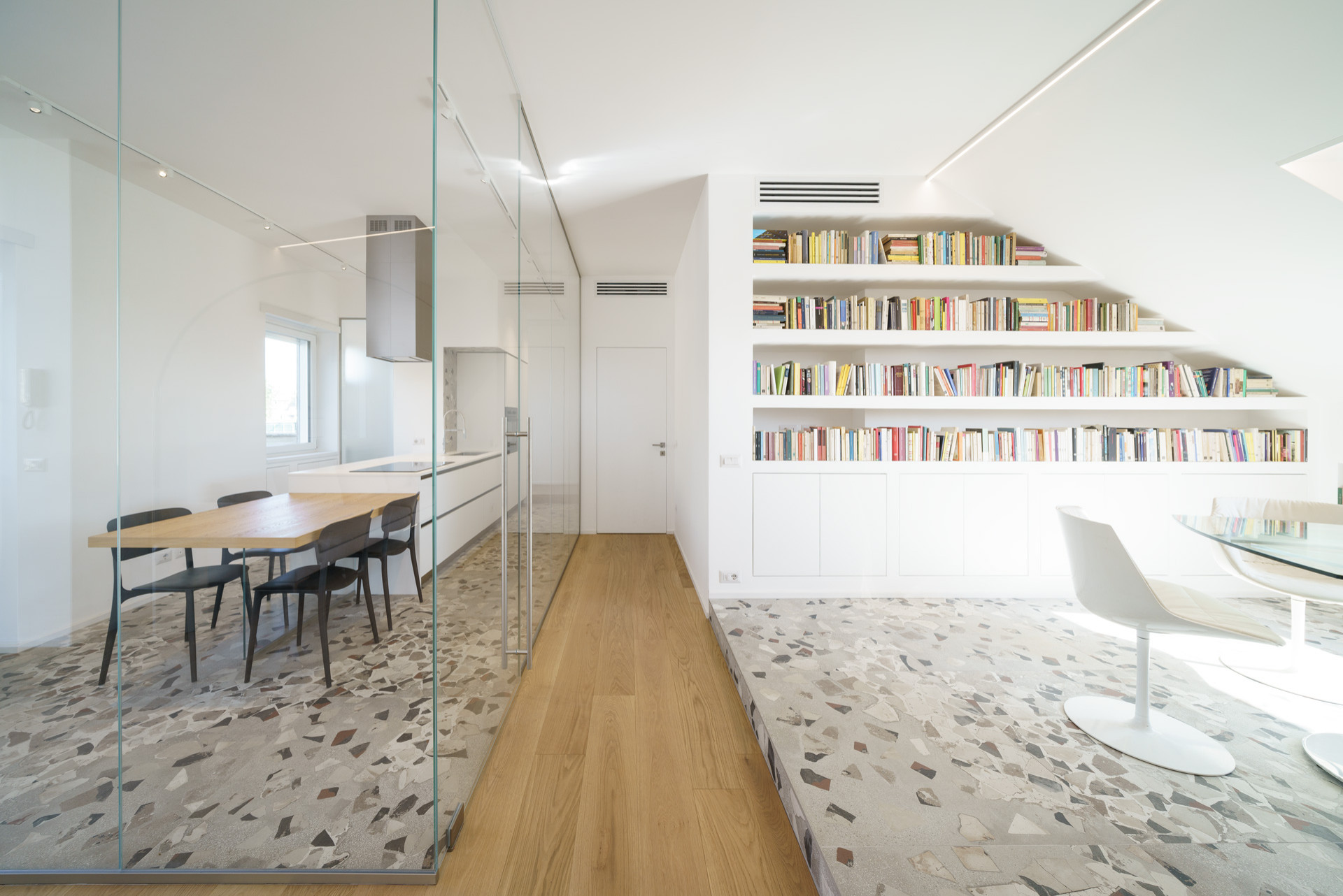 Trasparenze, addizioni e sottrazioni di volume, cambio di materiali e di superfici, sono gli elementi architettonici che contribuiscono alla dinamicità di questo appartamento dall’aspetto etereo.